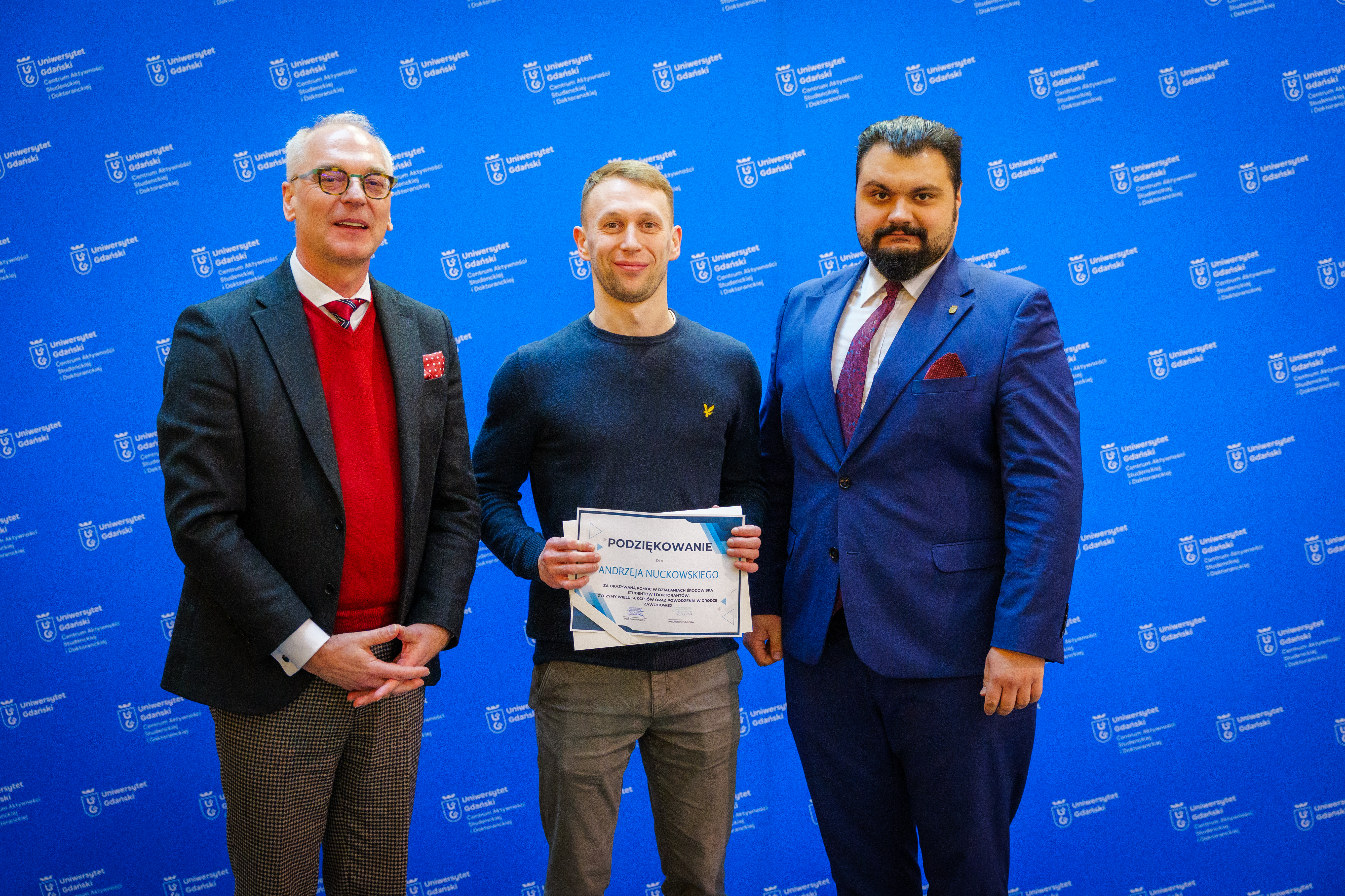 Następnie wystąpili przedstawiciele środowiska doktoranckiego i studenckiego UG: Przewodniczący Rady Doktorantów mgr Sebastian Barczak oraz Wiceprzewodniczący Parlamentu Studentów Piotr Patalas. Pierwszy z nich w kilku słowach podkreślił wyjątkowość wydarzenia, jakim jest Gala Aktywności Studenckiej i Doktoranckiej, mówiąc, że dzięki aktywnym studentom i doktorantom nasza Uczelnia staje się prawdziwą wspólnotą nauki, otwartą na nowe pomysły, dialog i współpracę. Piotr Patalas podziękował wszystkim wyróżnionym - pracownikom oraz studentom i doktorantom, którzy swoim zaangażowaniem zmieniają funkcjonowanie uniwersytetu. Wspomniał także, tak jak jego przedmówcy, prof. Dmochowskiego, nazywając go ogromnym przyjacielem środowiska studenckiego, a nagrodę jego imienia uznał za uhonorowanie działalności i aktywności profesora na rzecz uniwersytetu.