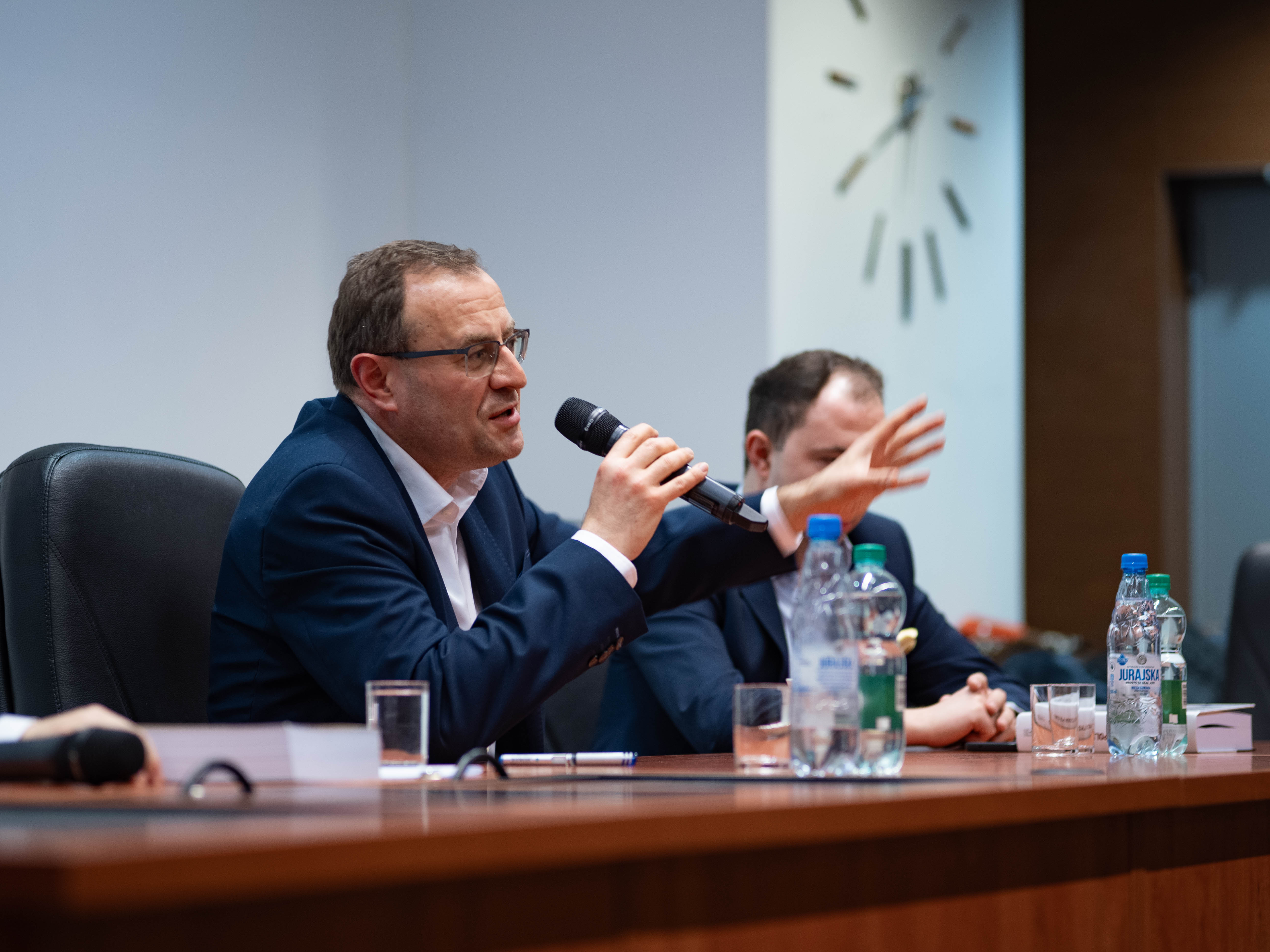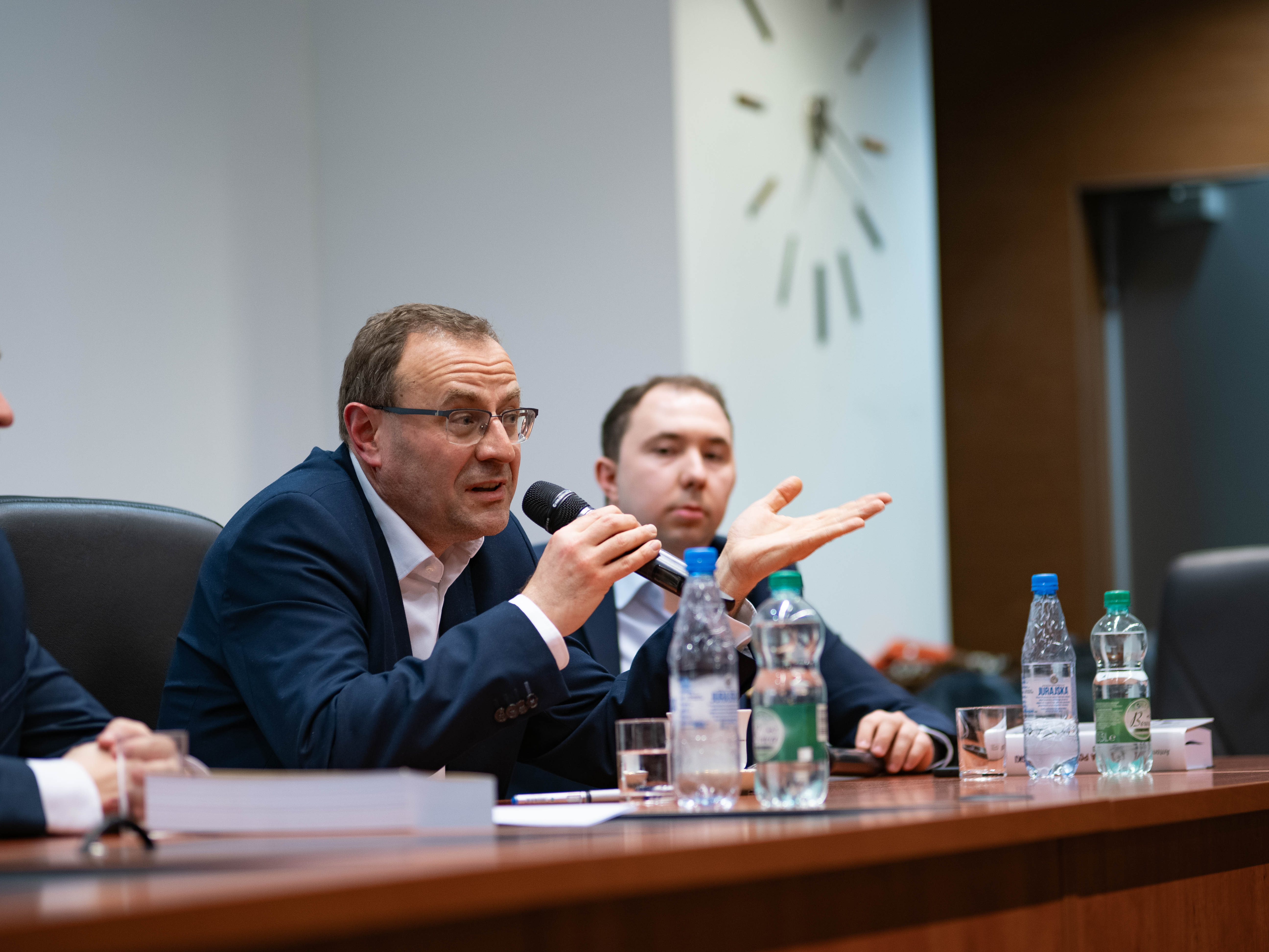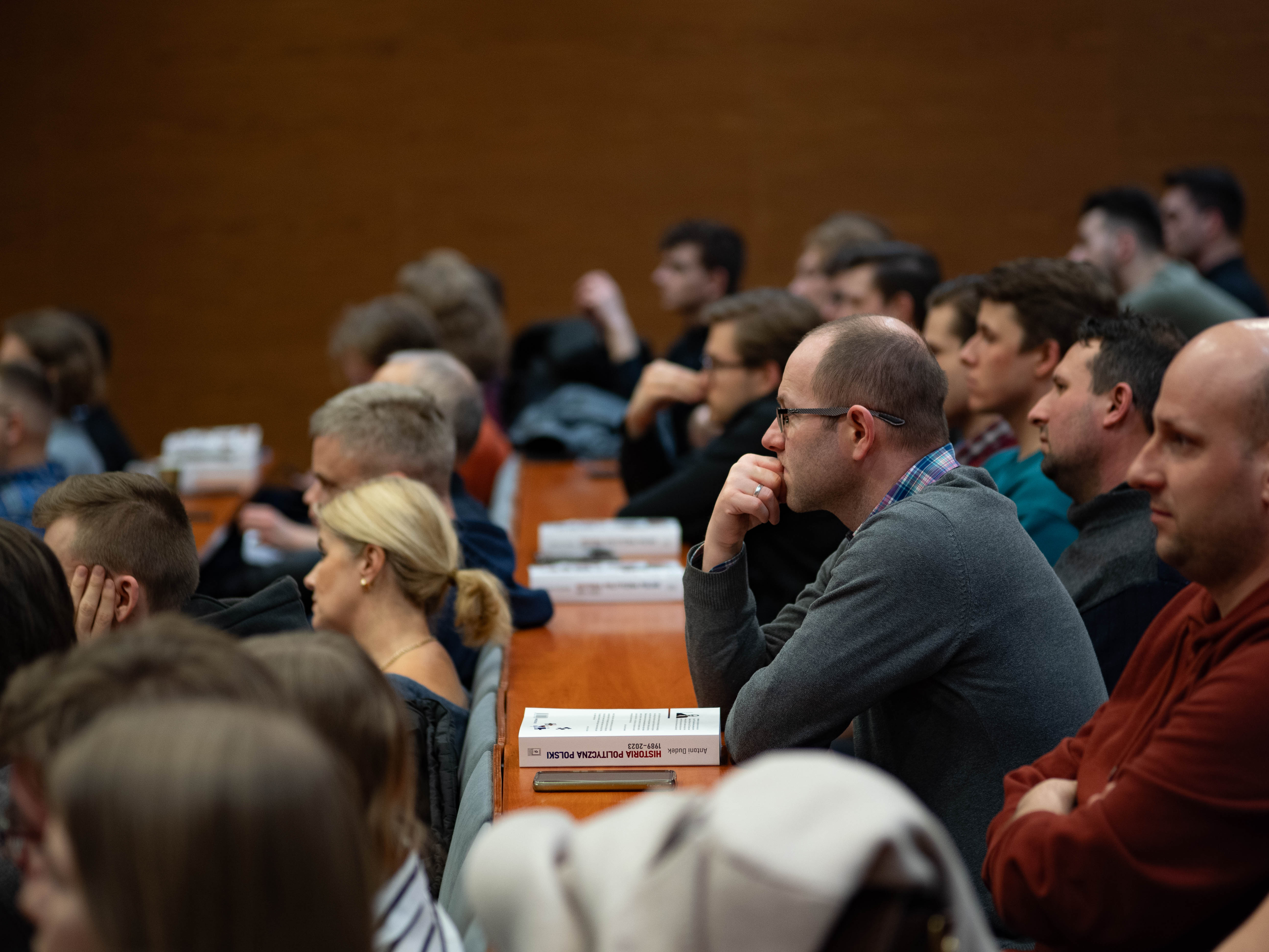 Drugą część rozmowy, dotyczącą aktualnych wydarzeń politycznych, poprowadził Mateusz Janota z Rady Dzielnicy Przymorze Wielkie. Poruszono m.in. temat odbudowy Pałacu Saskiego, funkcję Instytutu Pamięci Narodowej czy kwestię największych wyzwań stojących przed Polską. W przypadku tego ostatniego pytania prof. Antoni Dudek jako największe trudności stojące przed naszym krajem wymienił agresję Rosji oraz optymalną realizację i renegocjację zobowiązań wobec Unii Europejskiej związanych z polityką klimatyczną.