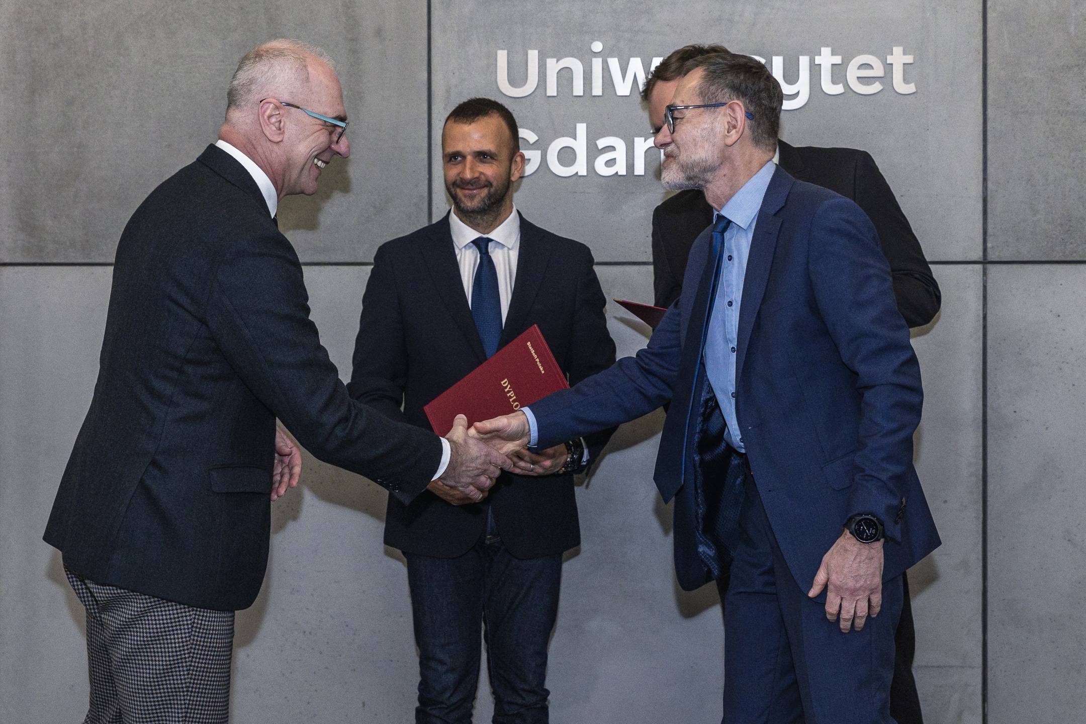 25 marca odbyło się spotkanie, podczas którego dr Tomasz Nowicki odebrał główną nagrodę w kategorii prac doktorskich w konkursie zorganizowanym przez StatSoft Polska Sp. z o.o. W spotkaniu udział wzięli również Prorektor ds. Studentów i Jakości Kształcenia dr hab. Arnold Kłonczyński, prof. UG, Prodziekan ds. Nauki Wydziału Zarządzania i promotor nagrodzonej pracy dr hab. Paweł Antonowicz, prof. UG oraz Dyrektor ds. Dydaktyki i Współpracy Naukowej StatSoft Polska Sp. z o.o. Janusz Wątroba.