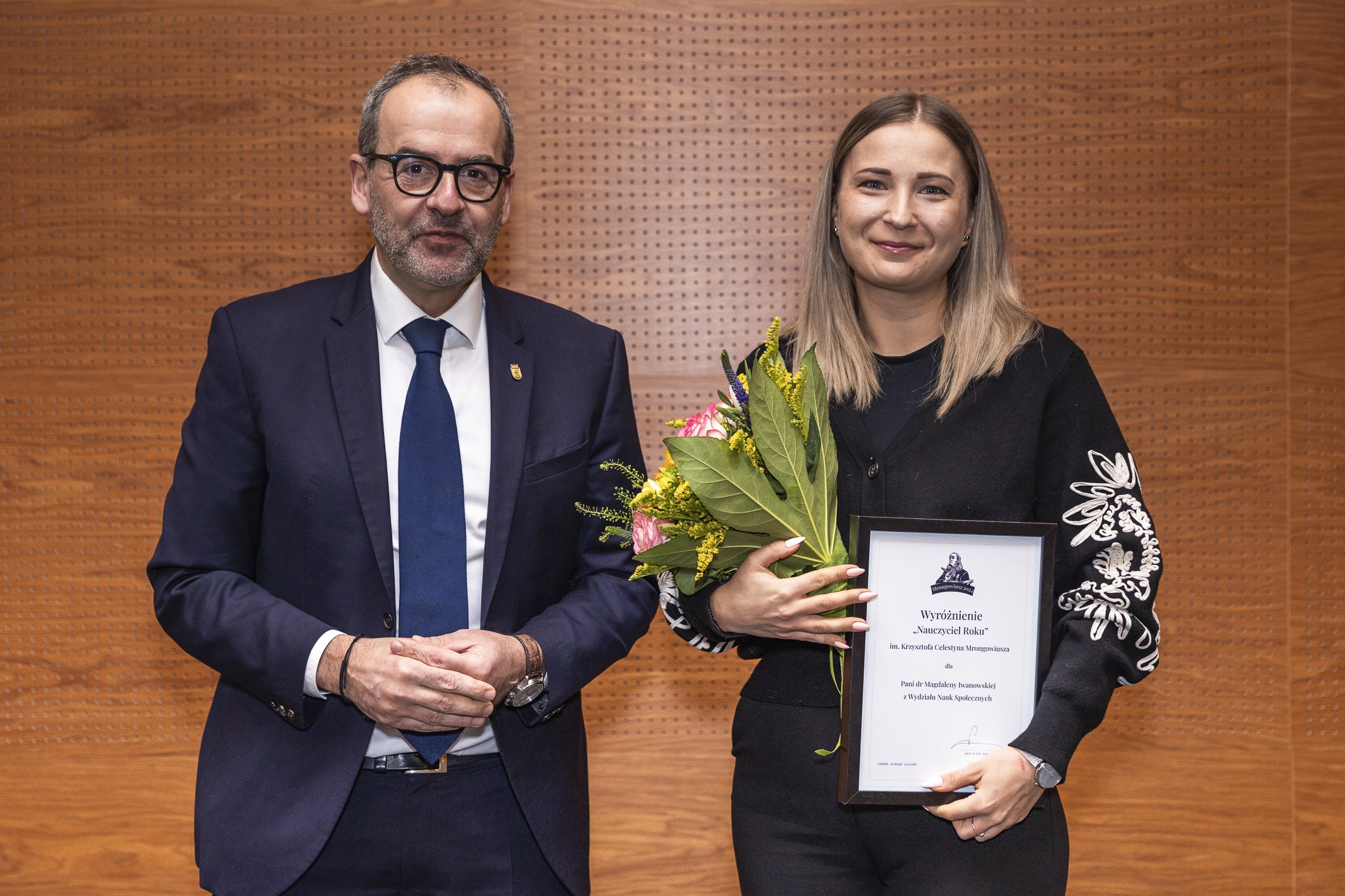 Wyróżnienia Nauczyciel Roku im. Krzysztofa Celestyna Mrongowiusza odebrały też, niemogące uczestniczyć w Gali 29 lutego 2024 r., dr Magdalena Iwanowska z Wydziału Nauk Społecznych oraz dr Anna Reglińska-Jemioł z Wydziału Filologicznego.