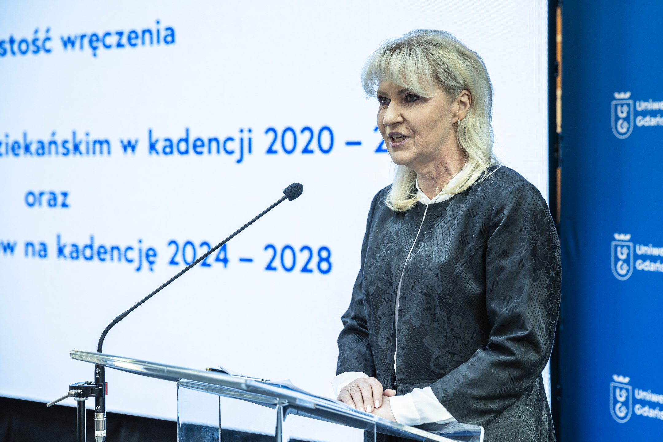 - Życzę Wam - życzę nam wszystkim - byśmy czerpali wiele radości i satysfakcji z bycia członkami społeczności naszej uczelni. Społeczności, która wykracza daleko poza codzienną pracę - powiedziała ustępująca Dziekan Wydziału Filologicznego dr hab. Urszula Patocka-Sigłowy, prof. UG, zwracając się do nowo nominowanych dziekanów. Pani Dziekan w imieniu wszystkich kończących kadencję podziękowała również Rektorowi i Prorektorom za minione lata inspirującej współpracy: - Dzięki entuzjazmowi, kreatywności i otwartości Prorektorki Anny Jurkowskiej-Zeidler wszyscy uwierzyliśmy, jak ważne jest umiędzynarodowienie. Dzięki kompetencjom, opanowaniu i dyplomacji Prorektora Arnolda Kłonczyńskiego zdołaliśmy przetrwać wszystkie zmiany legislacyjne w obszarze kształcenia i uzyskać dobre, pozytywne oceny komisji akredytacyjnych. Dzięki determinacji Prorektora Wiesława Laskowskiego uzyskaliśmy tak wysoką pozycję naukową. Dzięki wytrwałości, energii i konsekwencji Pani Prorektor Sylwii Mrozowskiej nawiązaliśmy tak szeroką współpracę z otoczeniem społeczno-gospodarczym. Ogromne wsparcie uzyskaliśmy także od zespołu kanclerskiego! Wreszcie osoba, bez której nasz uczelniany okręt nie pływałby po morzach i oceanach - Pan Rektor, prof. Piotr Stepnowski. Dziękujemy, że zajął Pan miejsce na mostku kapitańskim!