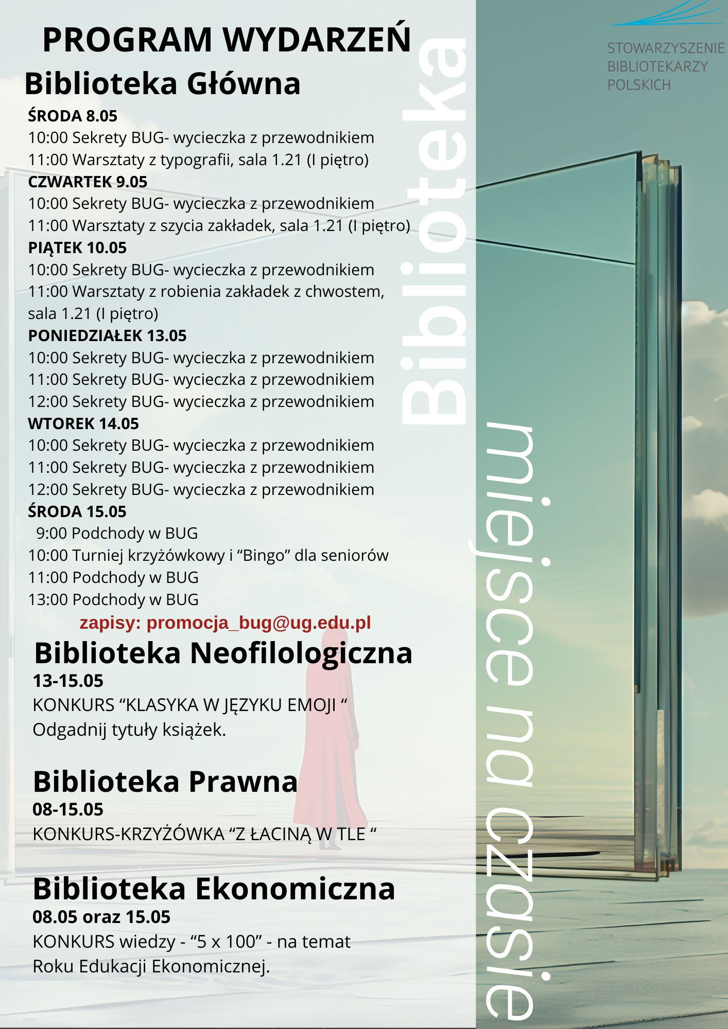 Nie zabraknie również konkursów z nagrodami, które zostaną zorganizowane w bibliotekach specjalistycznych: Bibliotece Neofilologicznej, Prawnej i Ekonomicznej.
