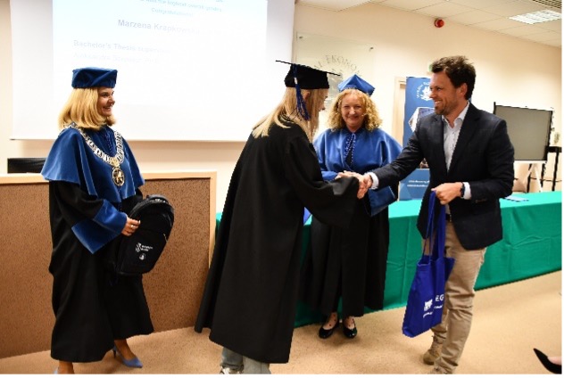 Dla absolwentów studiów licencjackich International Business ceremonia była wyjątkową okazją do świętowania w gronie rodziny, przyjaciół i krewnych. Studia te, uruchomione w 2008 roku, szybko zyskały renomę dzięki innowacyjnemu podejściu do nauki międzynarodowych aspektów biznesu. W ciągu trzech lat studenci zdobywają wiedzę oraz umiejętności niezbędne do pracy zawodowej przy analizie międzynarodowych zjawisk gospodarczych i społecznych z uwzględnieniem różnic kulturowych. Dodatkowo mają możliwość uzyskania międzynarodowego certyfikatu w laboratorium komputerowym London Stock Exchange Group Eikon Lab. Po studiach absolwenci są gotowi objąć takie stanowiska jak specjalista ds. rozwoju rynku, młodszy specjalista ds. importu i eksportu, analityk rynku czy analityk danych.