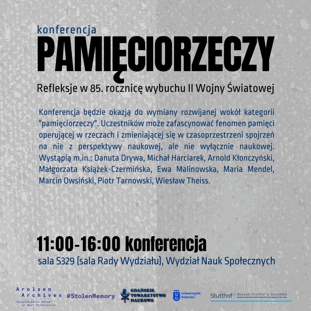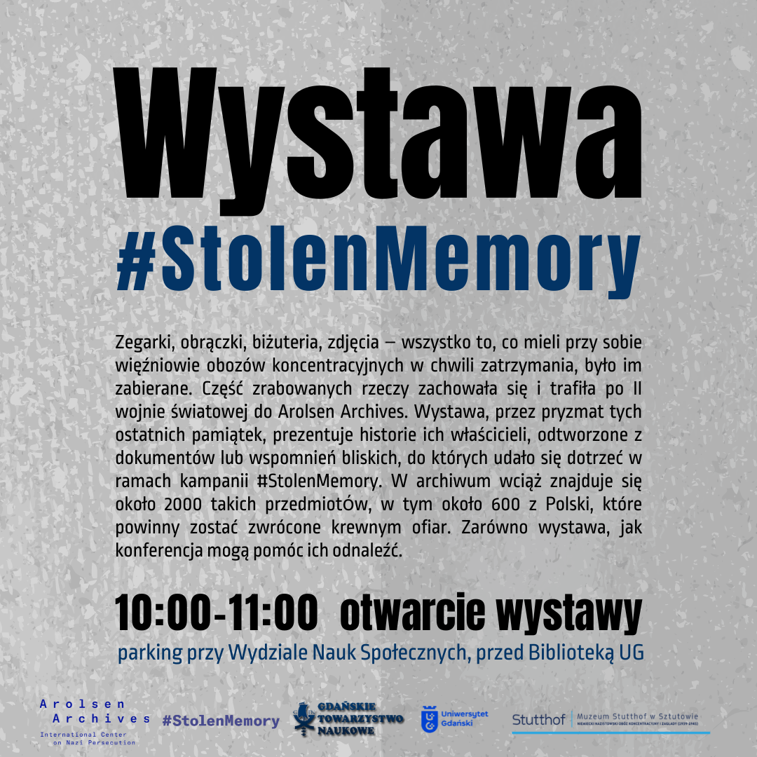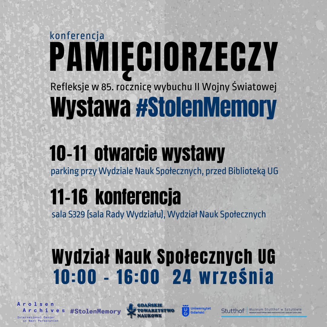 Uroczyste otwarcie wystawy #StolenMemory będzie miało miejsce 24 września na Wydziale Nauk Społecznych UG (ul. Bażyńskiego 4). W tym samym dniu odbędzie się konferencja „Pamięciorzeczy. Refleksje w 85. rocznicę wybuchu II Wojny Światowej”. Wydarzenia zaplanowane są w godz. 10:00 - 16:00.