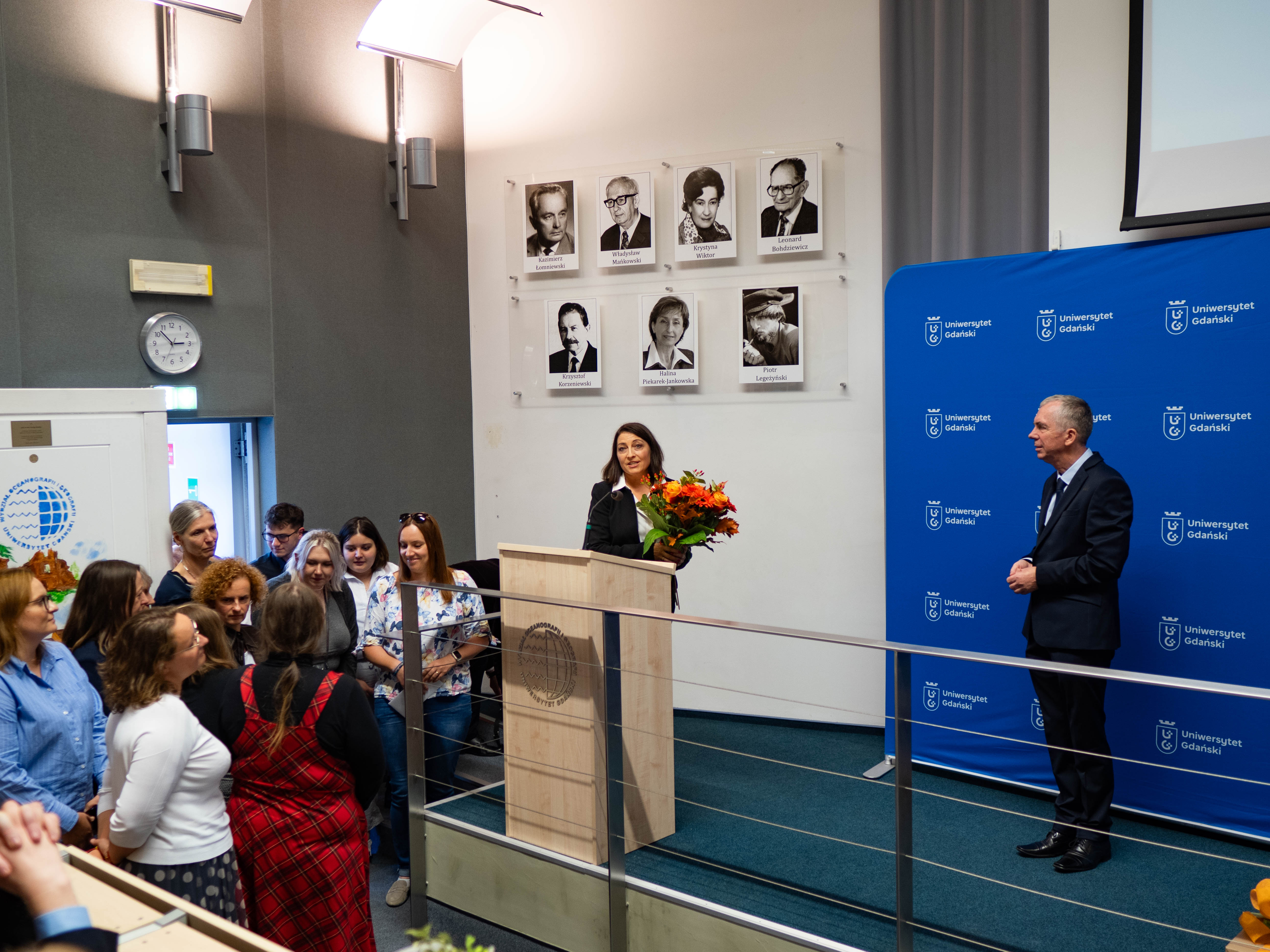 Karierę naukową jubilata zreferowała prof. dr hab. Magdalena Bełdowska, która przejmie kierownictwo Katedry Oceanografii Chemicznej i Geologii Morza po prof. Jerzym Bolałku. Naukowczyni opowiedziała o początkach drogi akademickiej jubilata, jako pierwszego absolwenta kierunku Oceanografia Fizyczna, o jego pierwszych krokach w Instytucie Oceanografii i w kolejnych strukturach UG, jego dorobku naukowym, a także mentorskim jako promotora prac doktorskich.