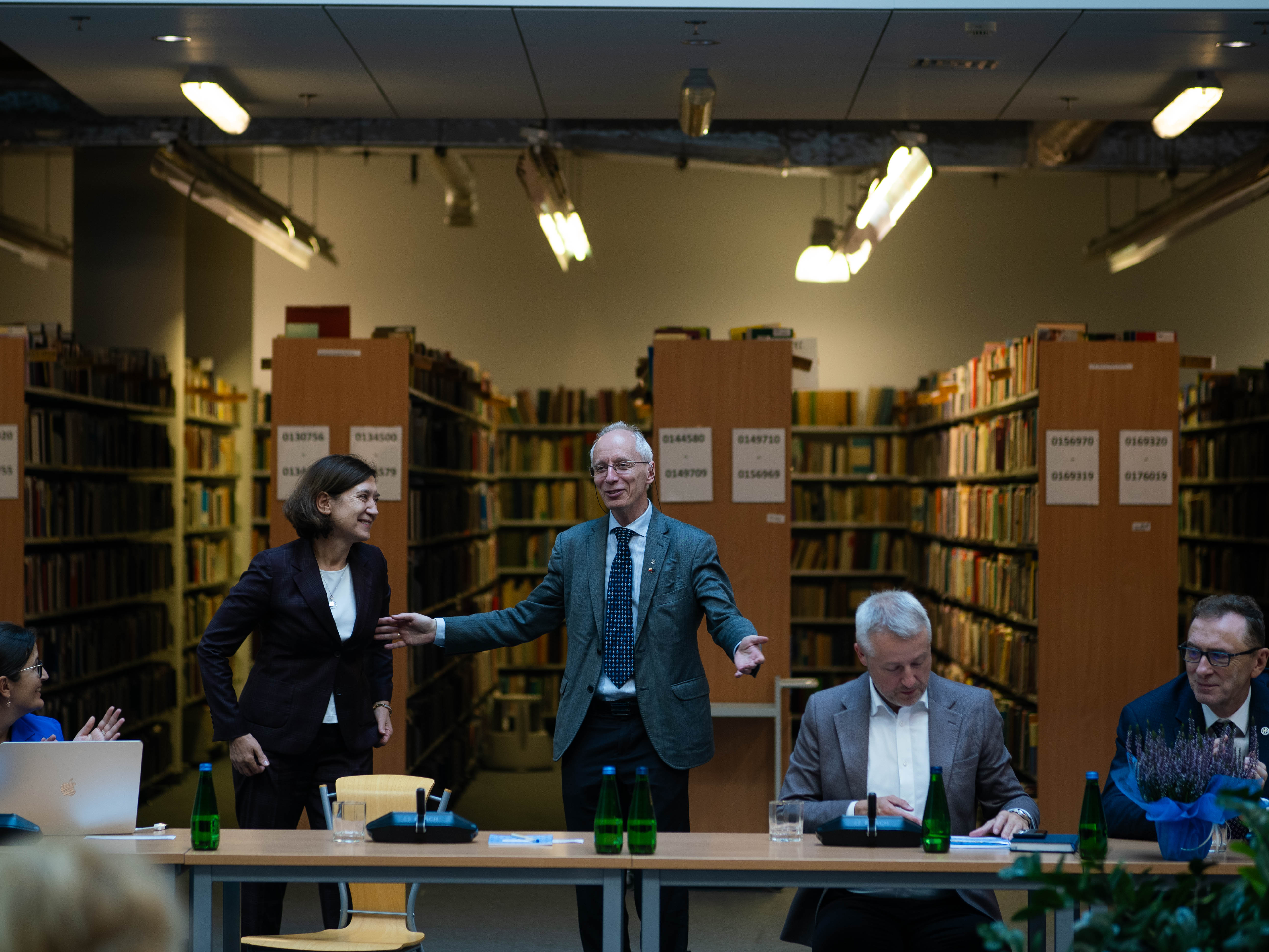 Przewodnicząca Uniwersyteckiej Komisji Nauki kadencji 2020-24 prof. dr hab. Izabela Święcicka wręczyła prof. Grzegorzowi Węgrzynowi okolicznościowy upominek w podziękowaniu za regularne informowanie UKN o działaniach i planach Rady Doskonałości Naukowej.