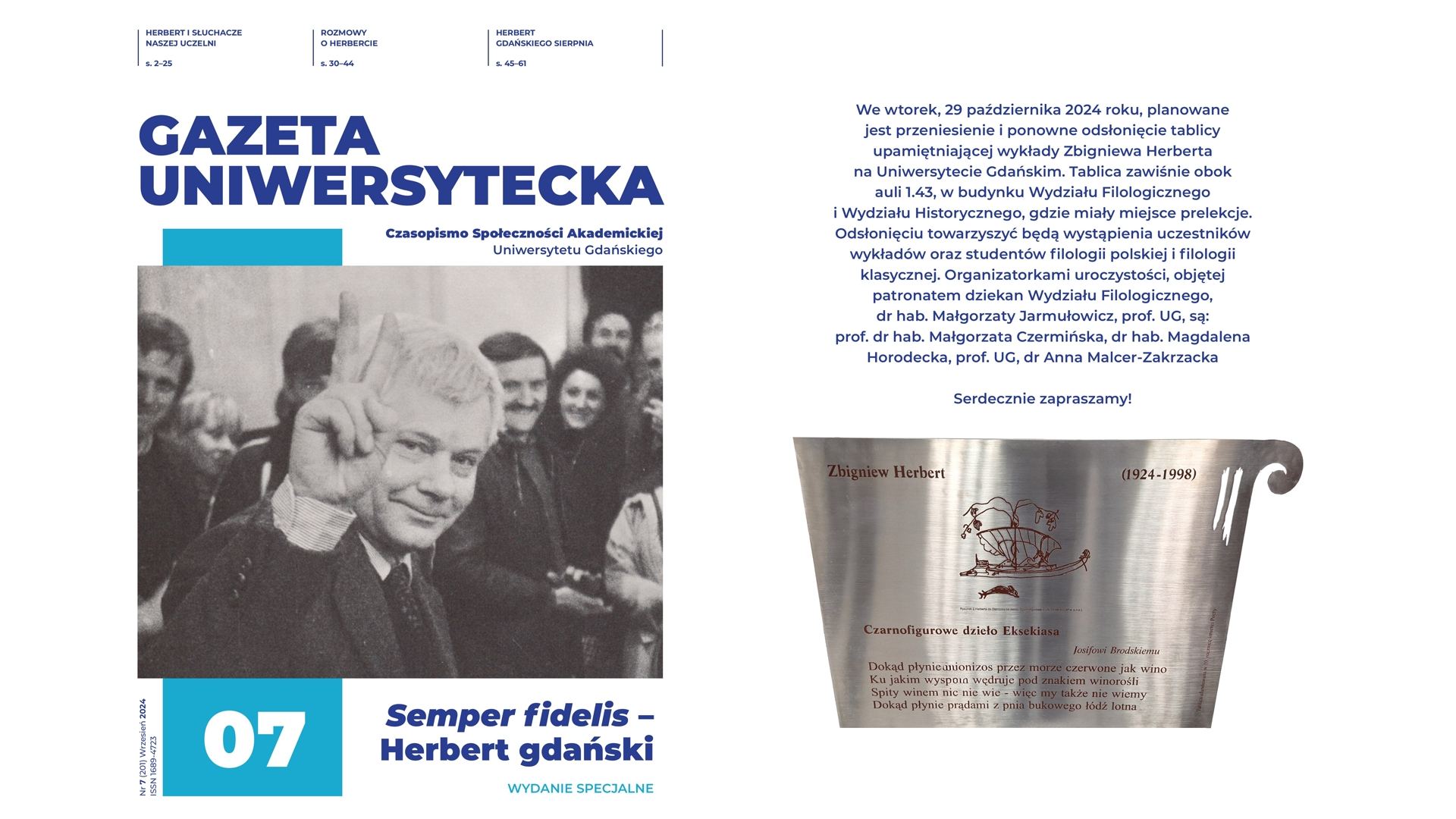 Redakcja „Gazety Uniwersyteckiej” UG zaprasza do lektury wrześniowego numeru specjalnego, poświęconego wybitnemu polskiemu poecie, Zbigniewowi Herbertowi. Autorzy i redaktorzy naukowi numeru położyli szczególny nacisk na ukazanie związków Herberta z Gdańskiem.