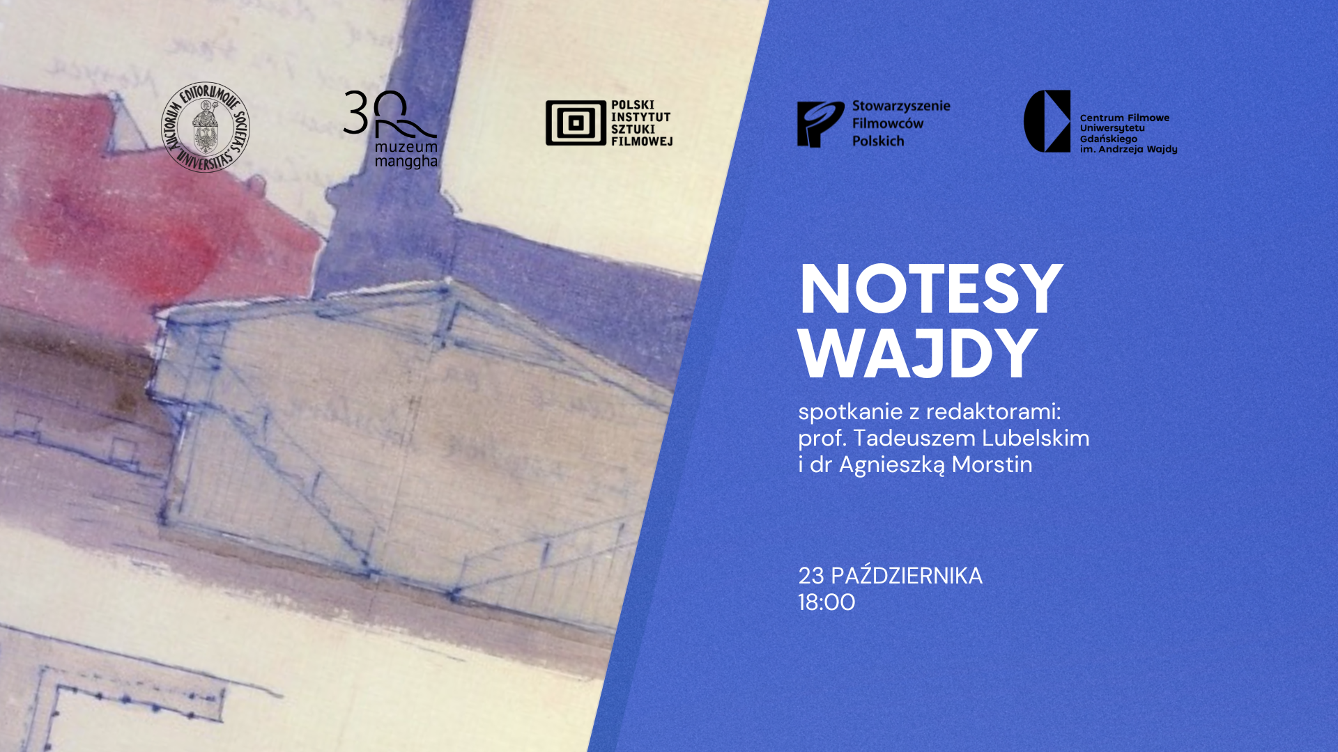 „Notesy” Andrzeja Wajdy powstawały przez 74 lata, ukazując kształtujące się poglądy mistrza polskiej kinematografii na sztukę (nie tylko filmową), a także na sferę polityczną, historyczną i… nieświadomą (Wajda opisywał w nich również swoje sny). Zebrane w czterech tomach przemyślenia artysty uzupełniają setki rysunków, szkiców i artykułów gromadzonych przez Wajdę. Centrum Filmowe UG zaprasza na spotkanie z redaktorami „Notesów” Andrzeja Wajdy - prof. Tadeuszem Lubelskim i Agnieszką Morstin - już 23 października o godzinie 18:00.