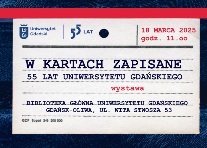 Wystawa „W kartach zapisane. 55 lat Uniwersytetu Gdańskiego”, to wybór 55 kart z katalogu kartkowego i katalogu online Biblioteki Uniwersytetu Gdańskiego. Opisane na nich prace wykładowców UG gromadzone są przez Bibliotekę od początku jej istnienia. Oglądając karty, śledzimy historię uczelni.
