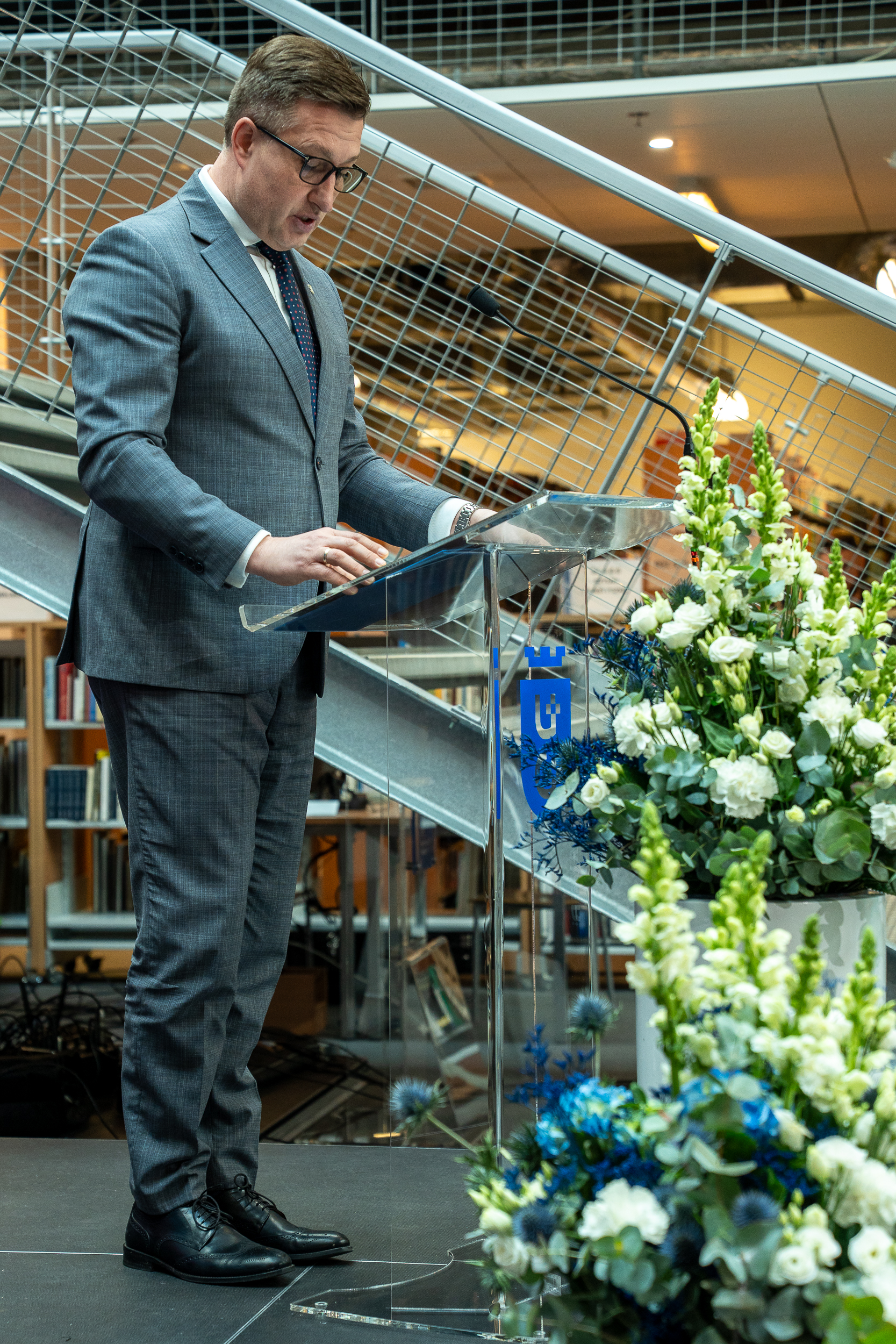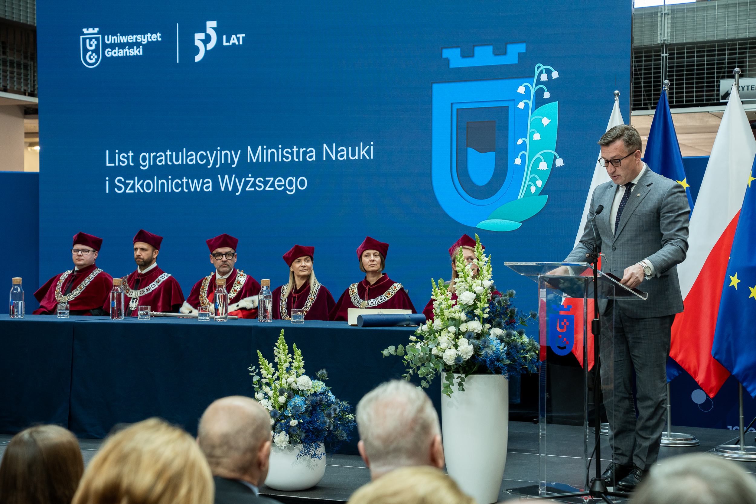 Po wystąpieniu Rektora UG w imieniu Ministra Nauki i Szkolnictwa Wyższego głos zabrał Dyrektor Generalny MNiSW, Marcin Iskra. Odczytawszy list Ministra, dr. Marcina Kulaska, z gratulacjami z okazji 55-lecia UG, podzielił się swoimi osobistymi życzeniami - oraz życzeniami całego zespołu Ministerstwa.
