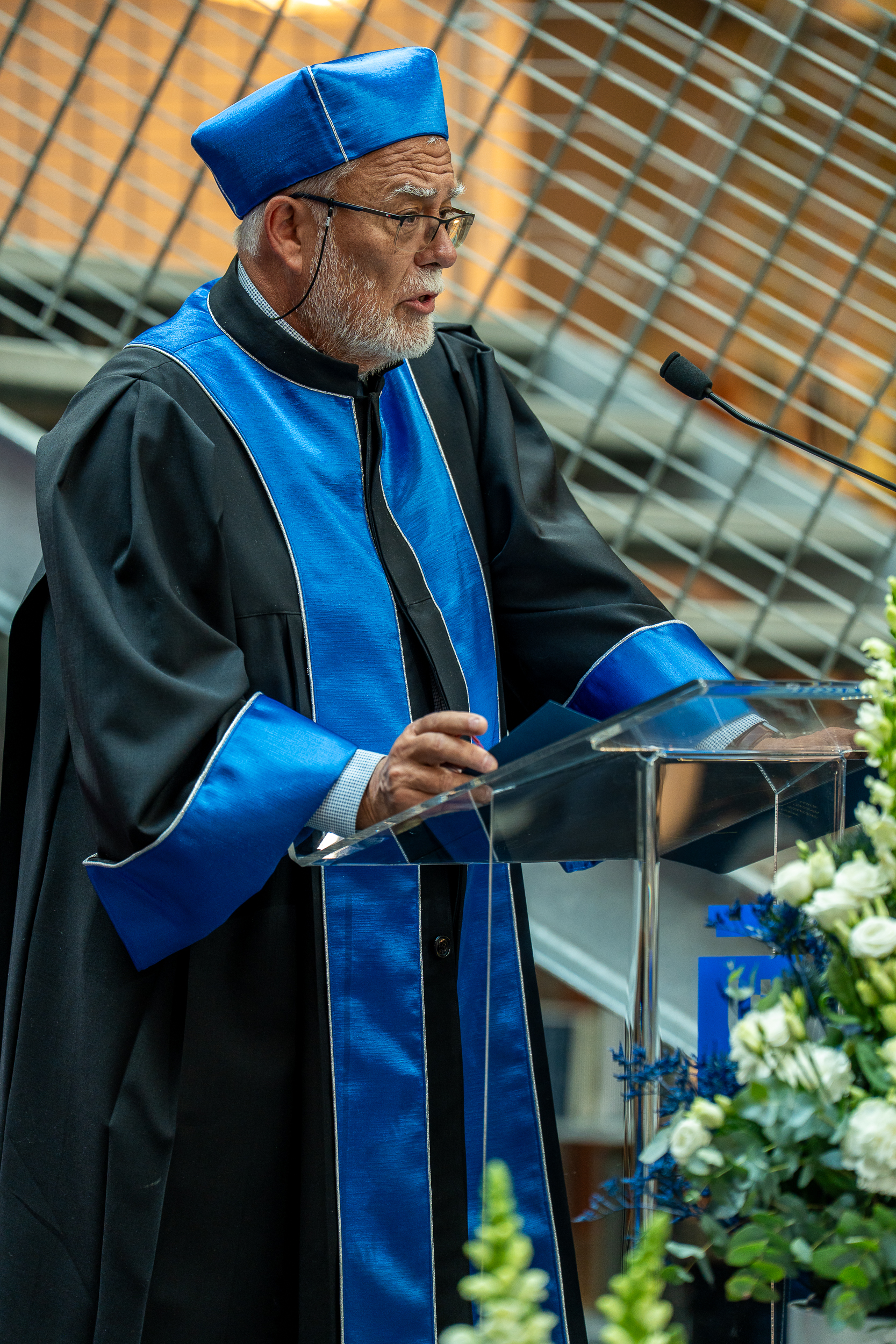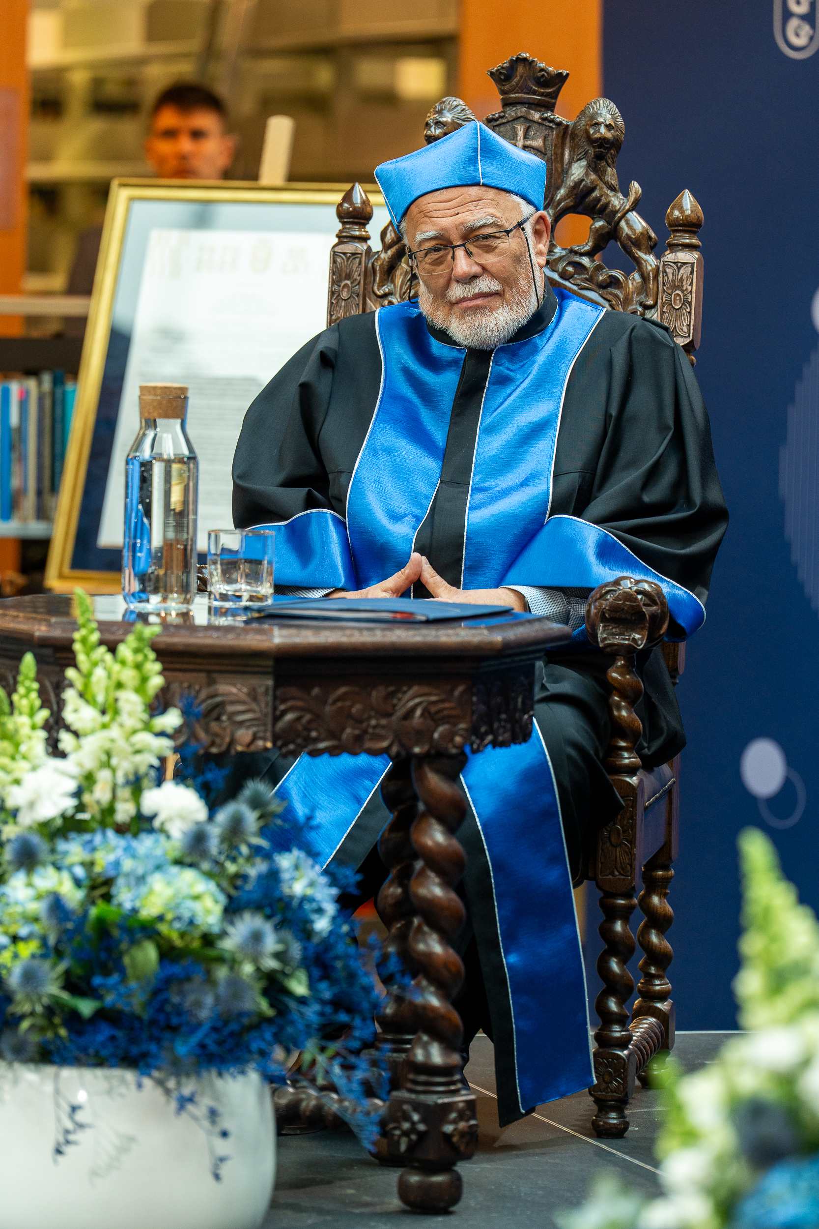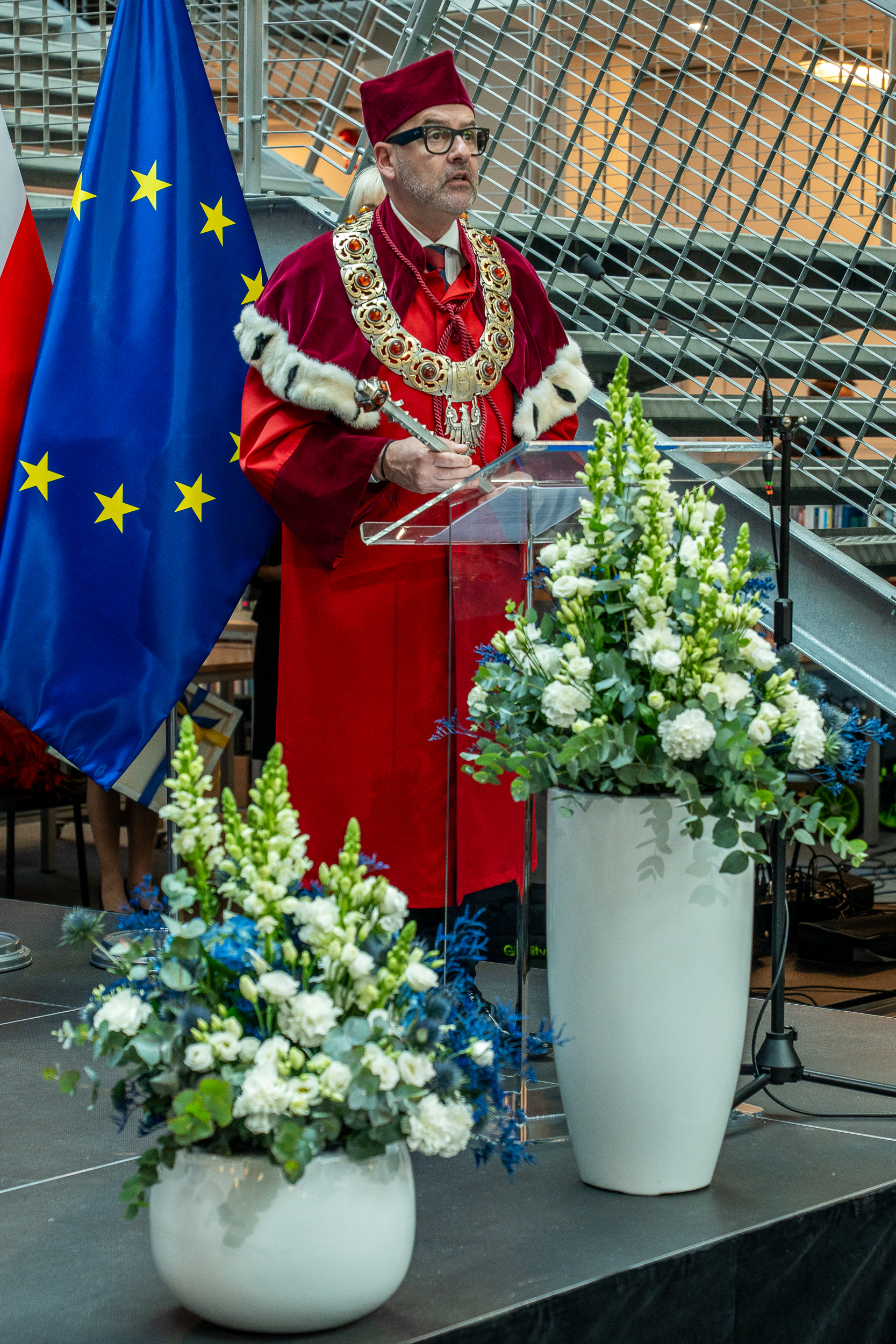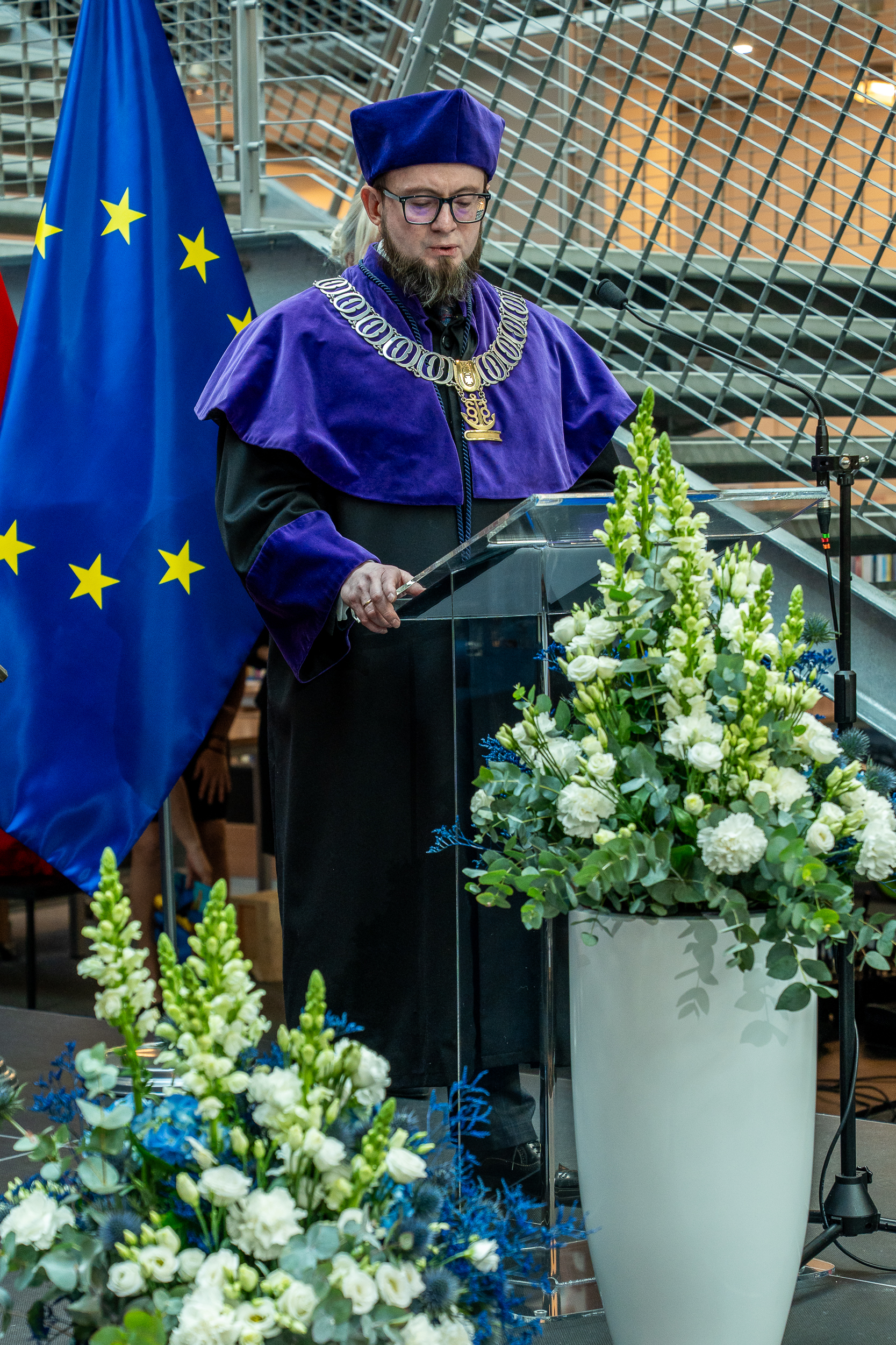 Po wystąpieniu prof. Sławomira Steinborna prof. Piotr Stepnowski, Rektor UG, przedstawił Uchwałę Senatu z dnia 21 listopada 2024 r. o nadaniu prof. Piotrowi Hofmańskiemu tytułu doktora honoris causa Uniwersytetu Gdańskiego „za jego zaangażowanie na rzecz europejskich wartości i standardów ochrony praw człowieka opartych na podmiotowości ludzkiej jednostki, niezbywalnej godności i wolności człowieka oraz znaczeniu dążenia do prawdy w ludzkiej aktywności, a także za jego działalność na rzecz urzeczywistnienia idei globalnego systemu odpowiedzialności za zbrodnie międzynarodowe”. Treść dyplomu doktora honoris causa odczytał dr hab. Wojciech Zalewski, prof. UG, Dziekan Wydziału Prawa i Administracji.