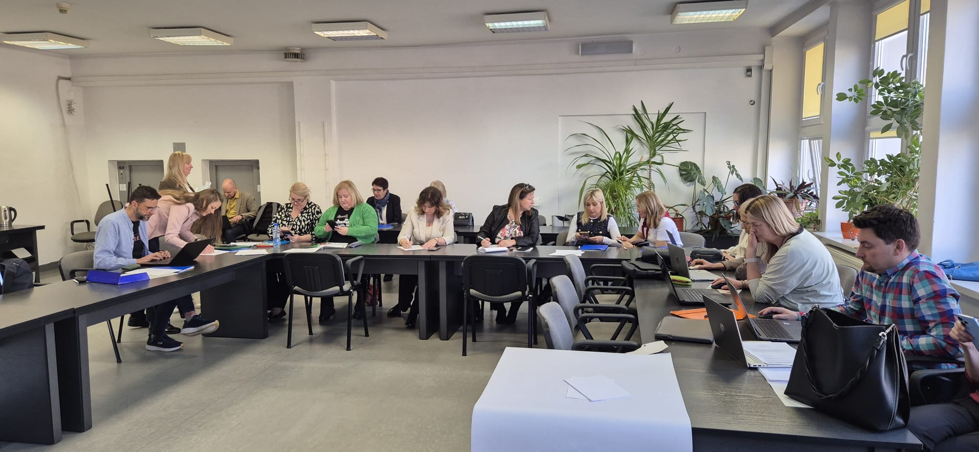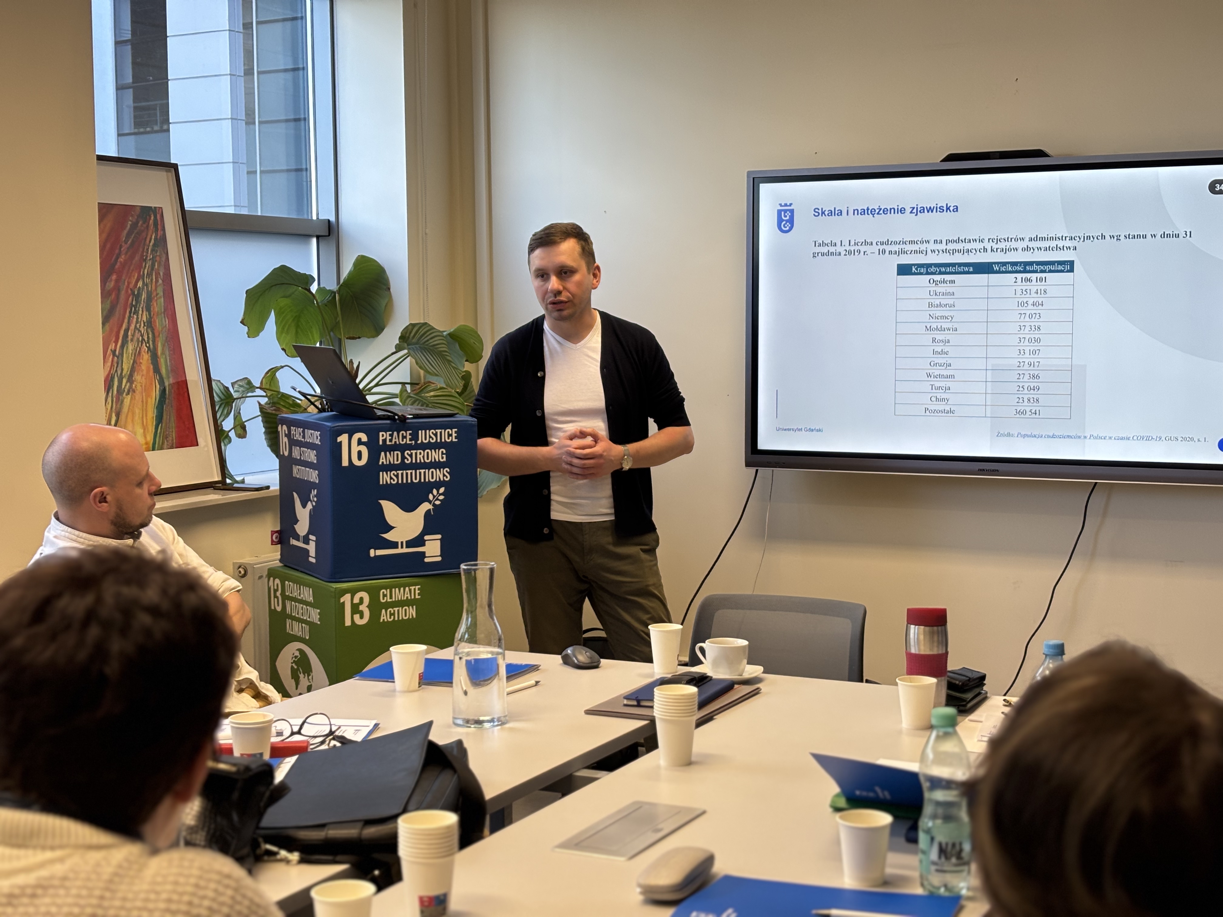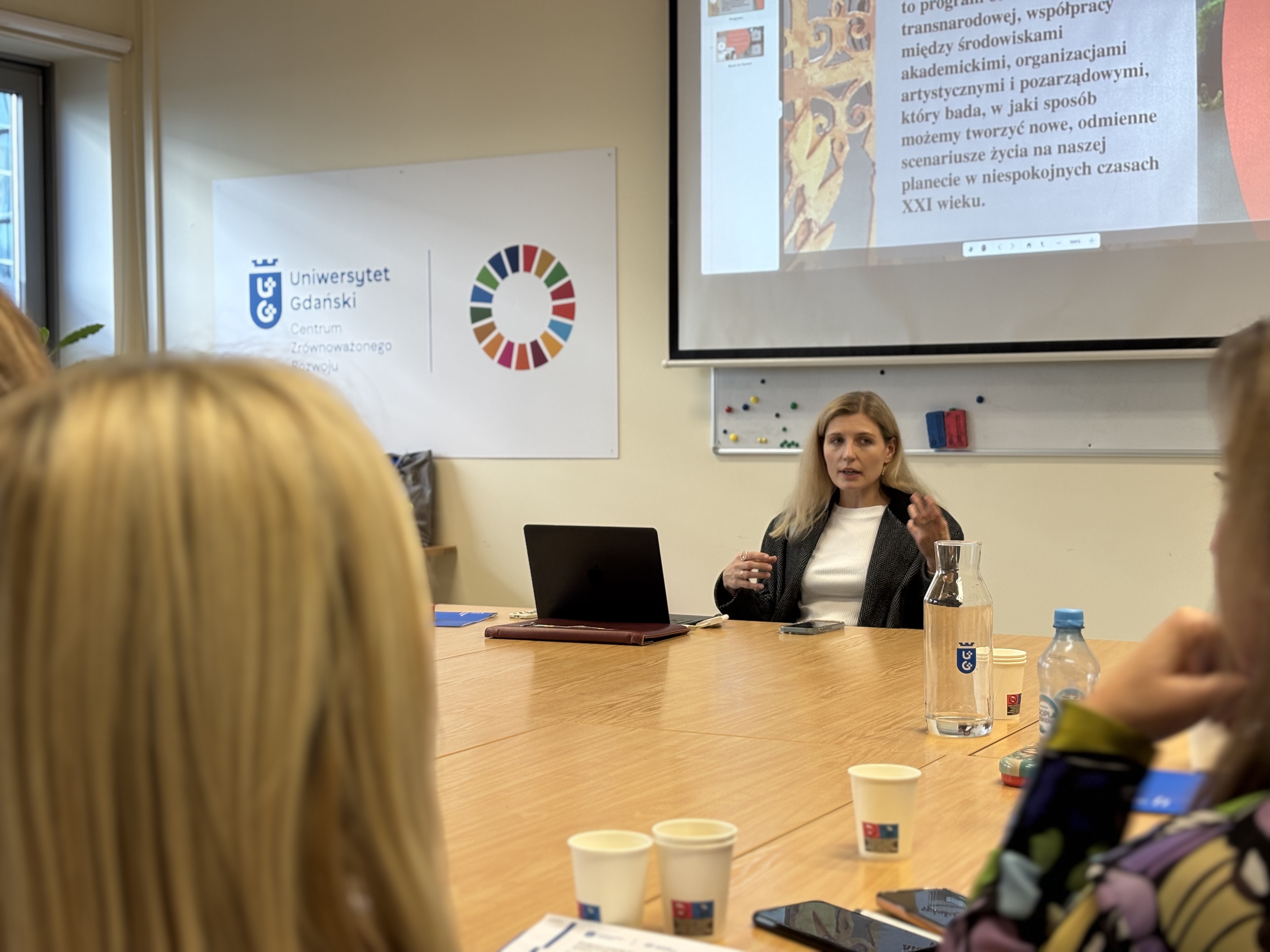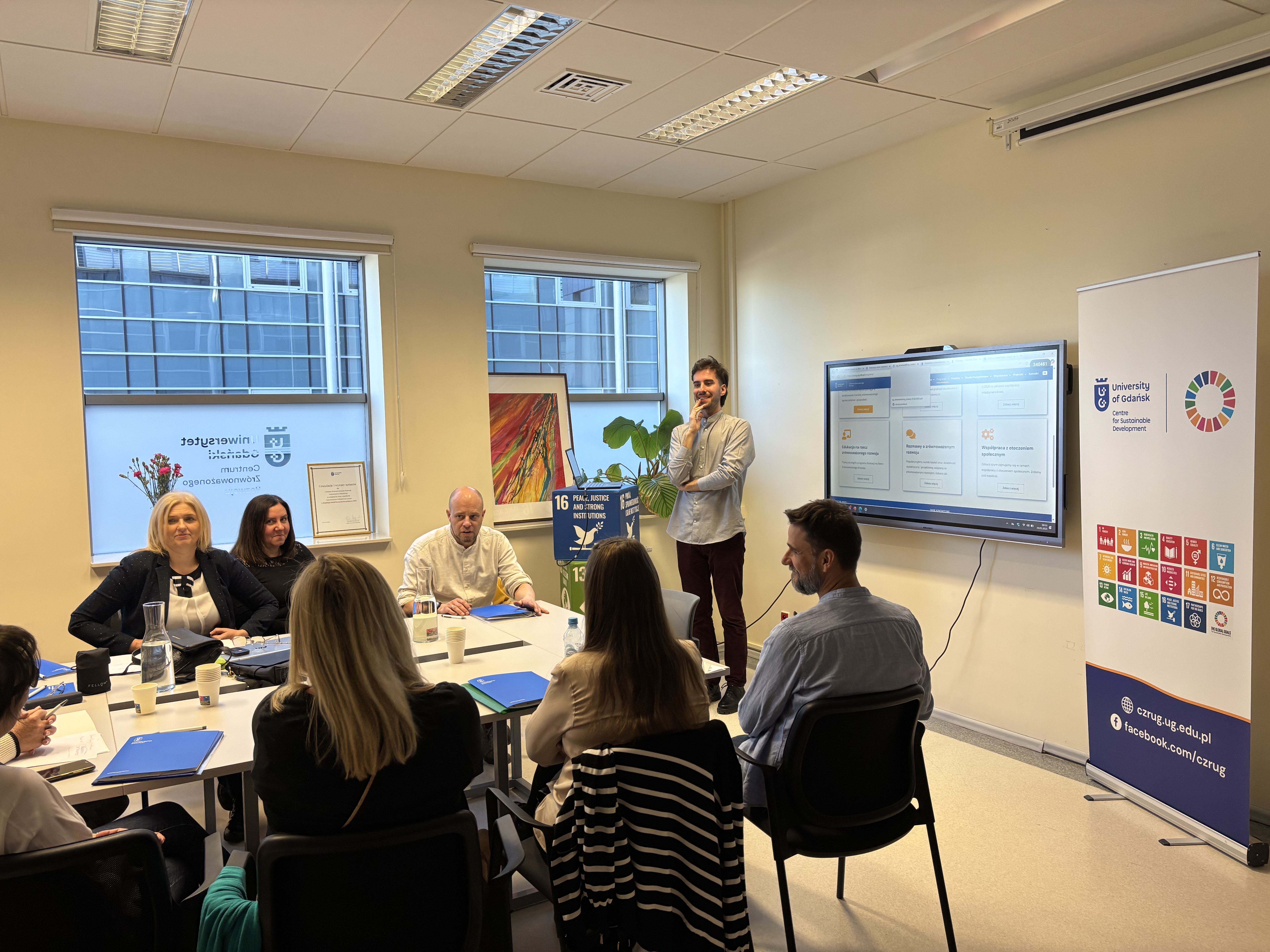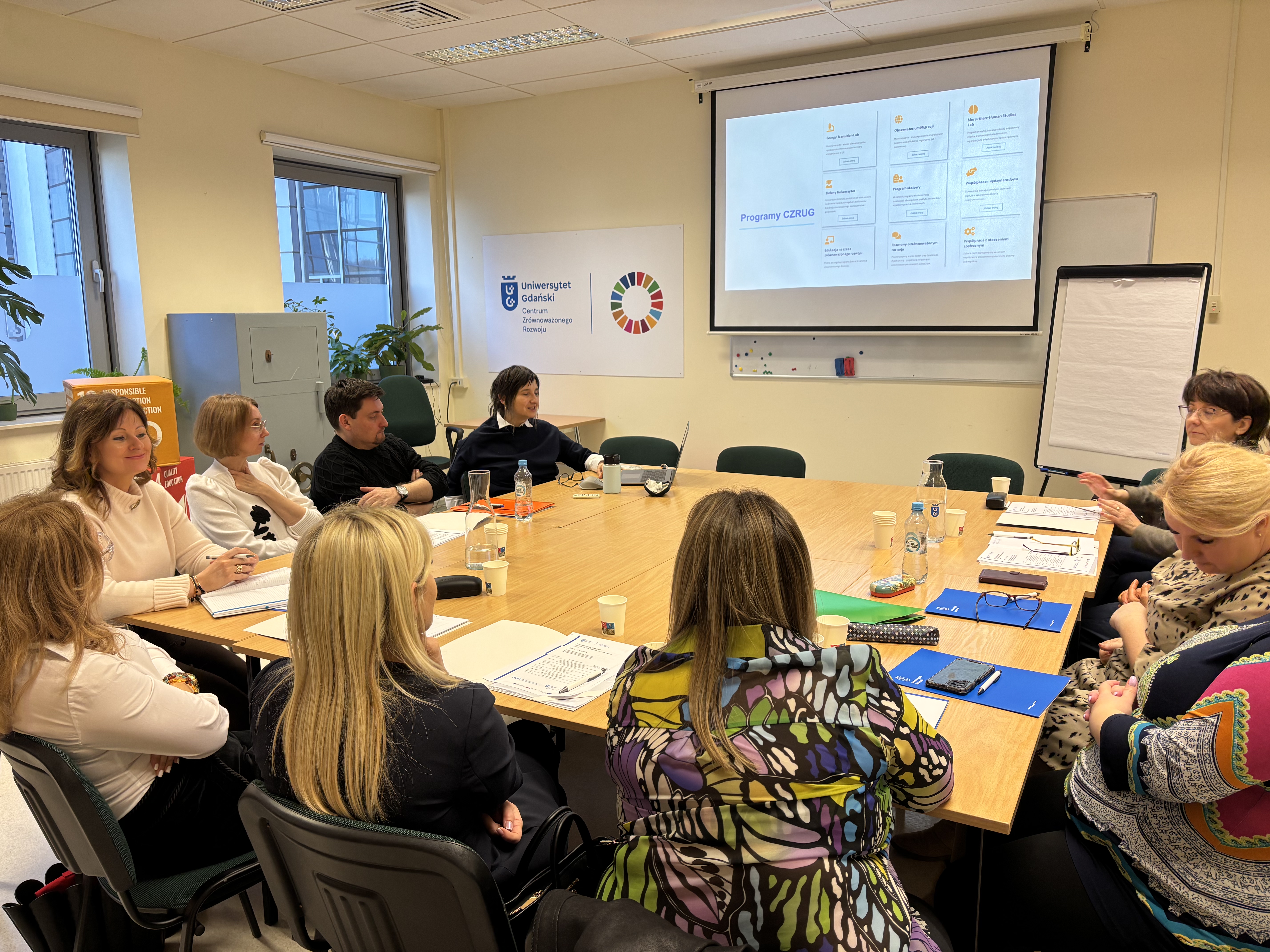 Pierwszy dzień wizyty, 19 marca, upłynął w Centrum Zrównoważonego Rozwoju na Wydziale Nauk Społecznych UG. Uczestników przywitała dr Barbara Kijewska, prof. UG, koordynatorka programu stażowego CZRUG. W ramach spotkania przeprowadzono trzy bloki zajęć. Pierwszy z nich dotyczył działalności Centrum Zrównoważonego Rozwoju. Dr Barbara Kijewska, prof. UG oraz Kuba Gudzinowicz przedstawili zasady funkcjonowania jednostki, omówili metody komunikacji z interesariuszami oraz zaprezentowali realizowane programy i przykłady dobrych praktyk. Podczas dwóch kolejnych bloków warsztatowych uczestnicy zapoznali się z wybranymi przykładami realizacji programów CZRUG. Pierwszy z nich - Obserwatorium Migracji - został omówiony przez dr. Rafała Raczyńskiego, koordynatora programu Obserwatorium Migracji, oraz dr Elżbietę Czapkę, koordynatorkę programu Współpraca międzynarodowa. Drugi blok warsztatowy dotyczył realizacji programu More-than-Human Studies Lab, o którym opowiedziała jego koordynatorka, dr Irena Chawrilska.