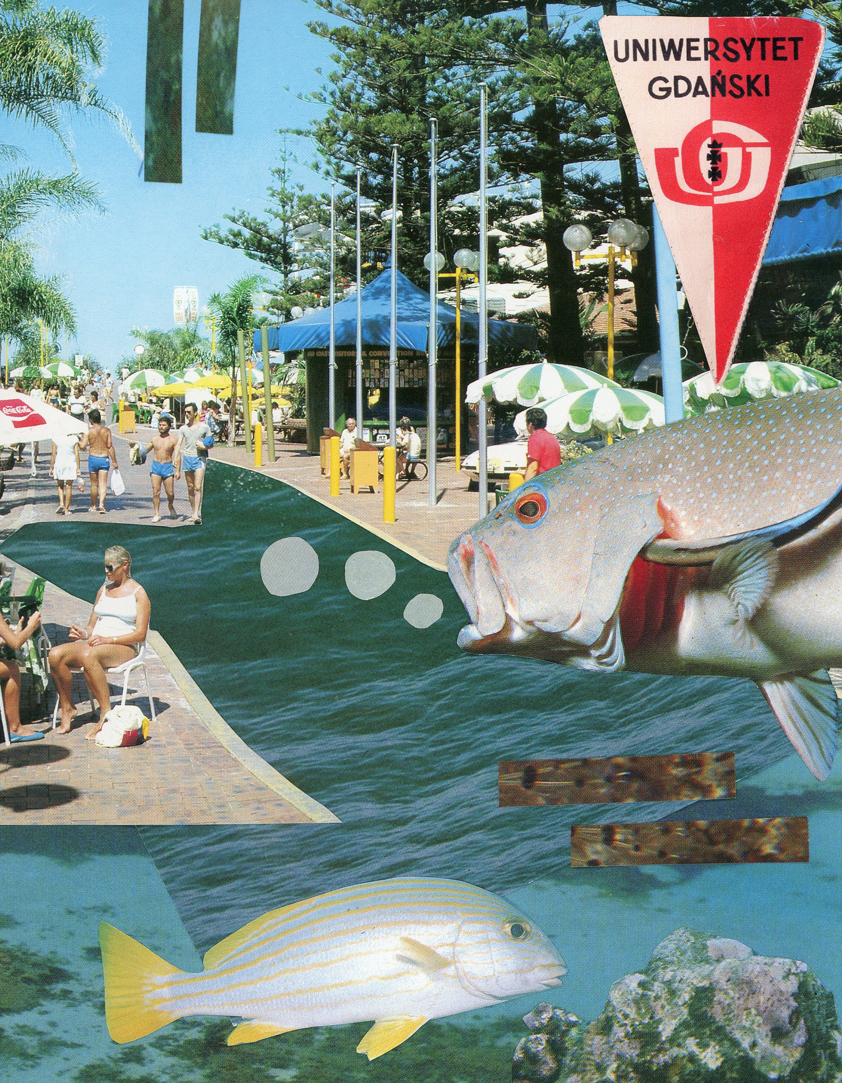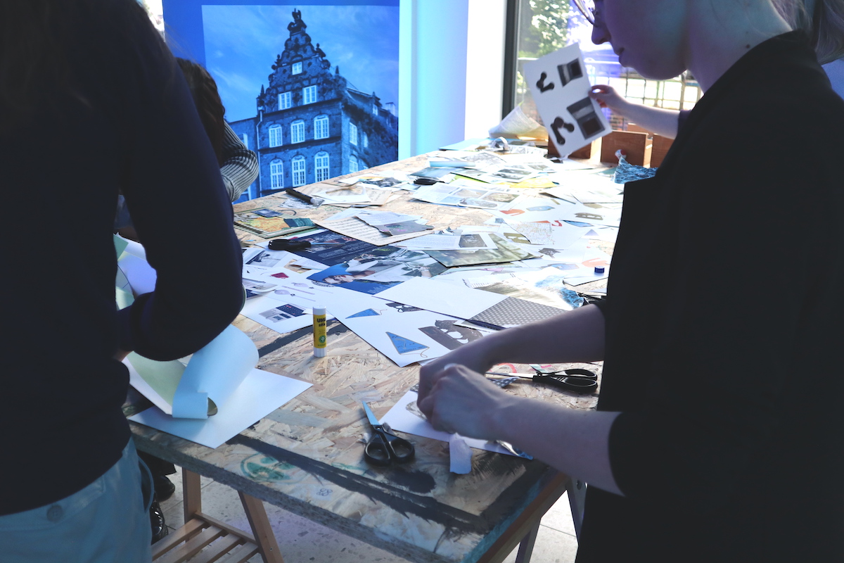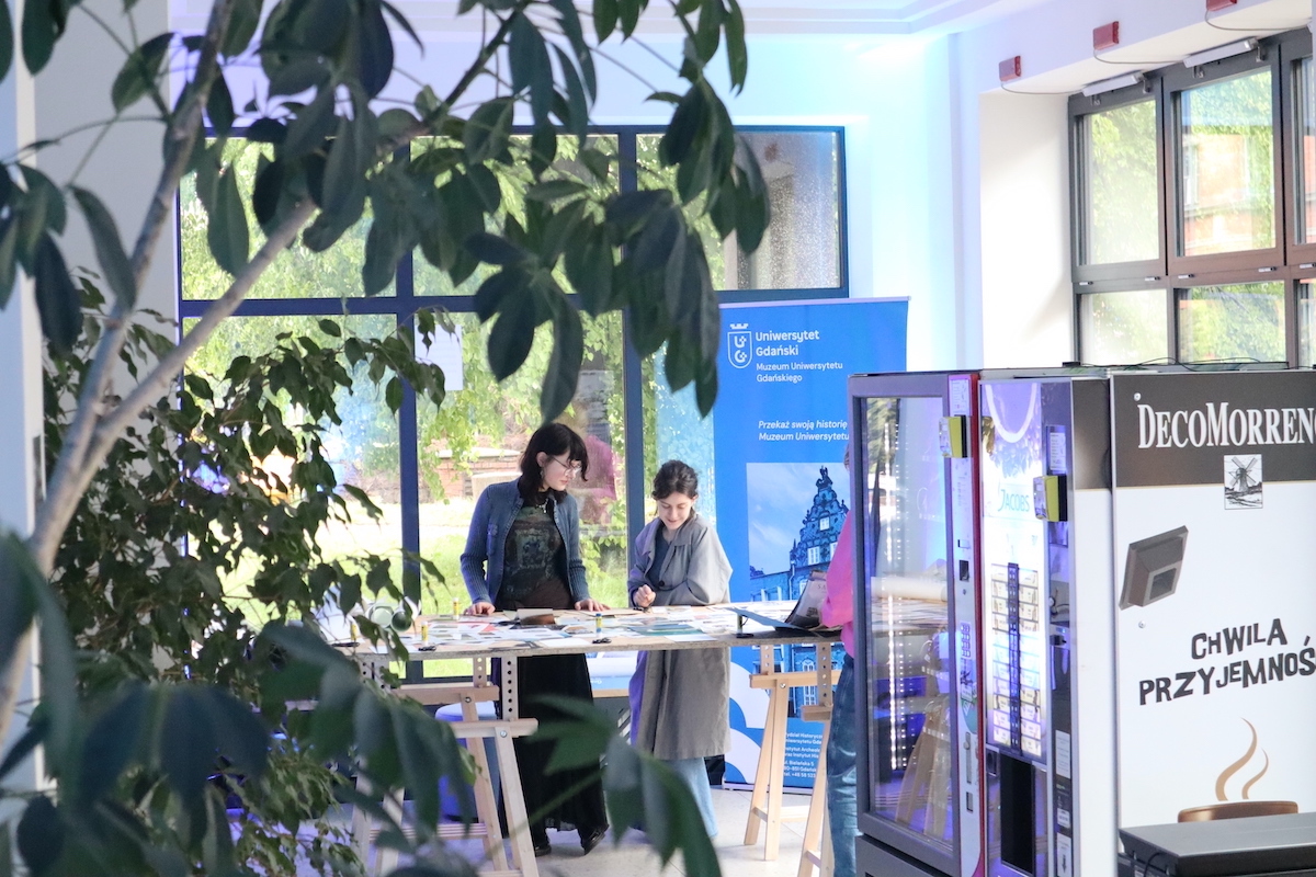 Odwiedzający mogli również uczestniczyć w warsztatach kolażu inspirowanych wystawą stałą i akademicką historią Uniwersytetu Gdańskiego. Odbywały się one przez cały czas trwania wydarzenia - nie obowiązywały wcześniejsze zapisy, a wszystkie materiały potrzebne do stworzenia dzieła były dostępne na miejscu. Prowadząca je Karolina Tomaszewska, projektantka graficzna i ilustratorka, służyła pomocą wszystkim zainteresowanym. Dzięki temu każdy niezależnie od wieku czy doświadczenia mógł spontanicznie dołączyć do wspólnej twórczości. Prace powstawały w swobodnej, przyjaznej atmosferze, a uczestnicy chętnie dzielili się swoimi pomysłami i własnymi interpretacjami historii uniwersytetu. Gotowe kolaże były na bieżąco skanowane i prezentowane na ekranie w holu, co tworzyło efekt żywej, rozwijającej się ekspozycji. Dla wielu gości była to nie tylko okazja do wyrażenia swojej kreatywności, ale też do głębszego, osobistego kontaktu z przeszłością uczelni.
