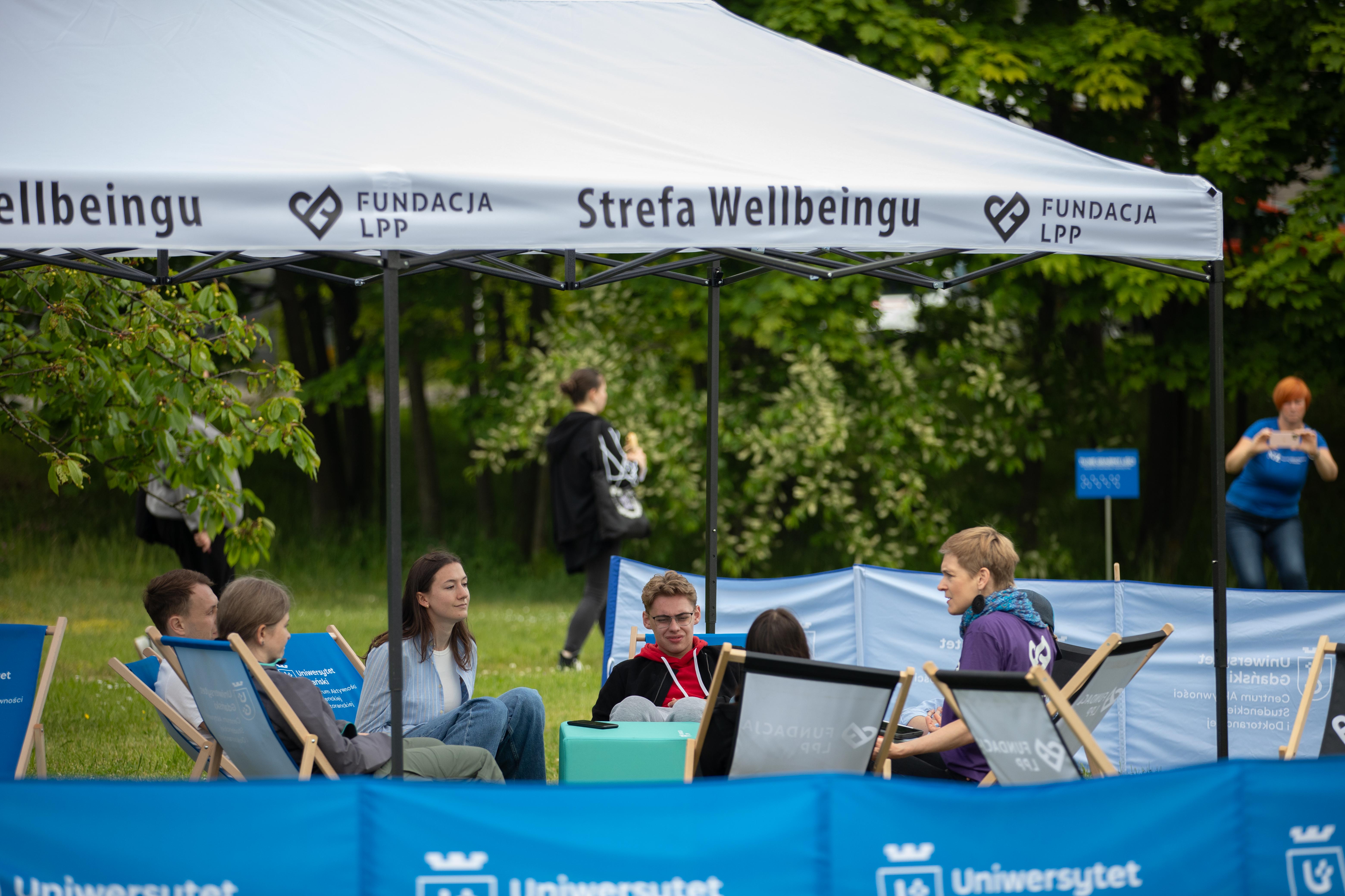 Strefa well being to pierwsze stanowisko, na które natykają się osoby wchodzące na teren Majówki z UG od strony budynku Rektoratu i Neofilologii. Ono także w znacznej mierze oddaje ideę imprezy: przyjdź, zatrzymaj się na chwilę, zrelaksuj. Po prostu bądź.