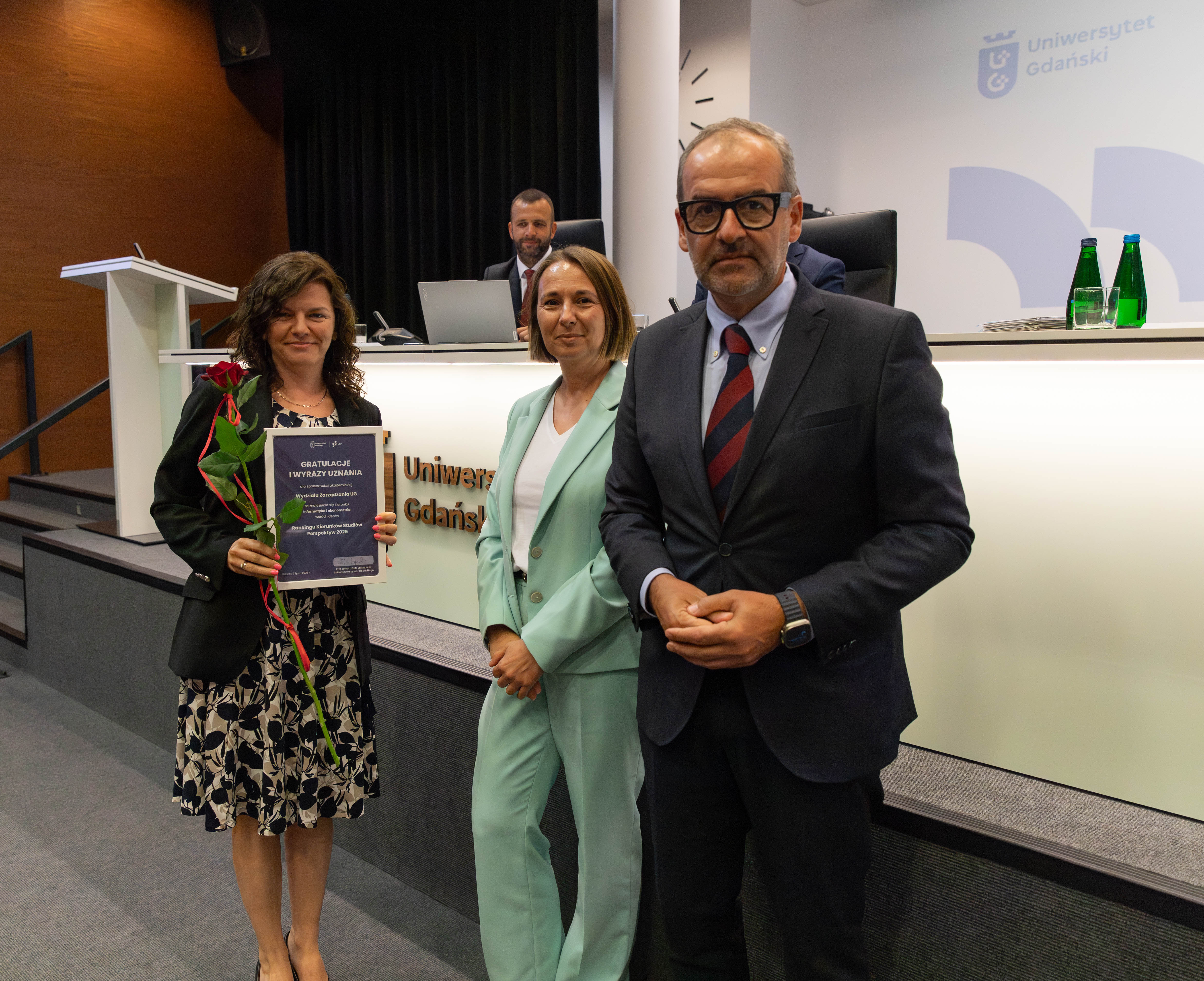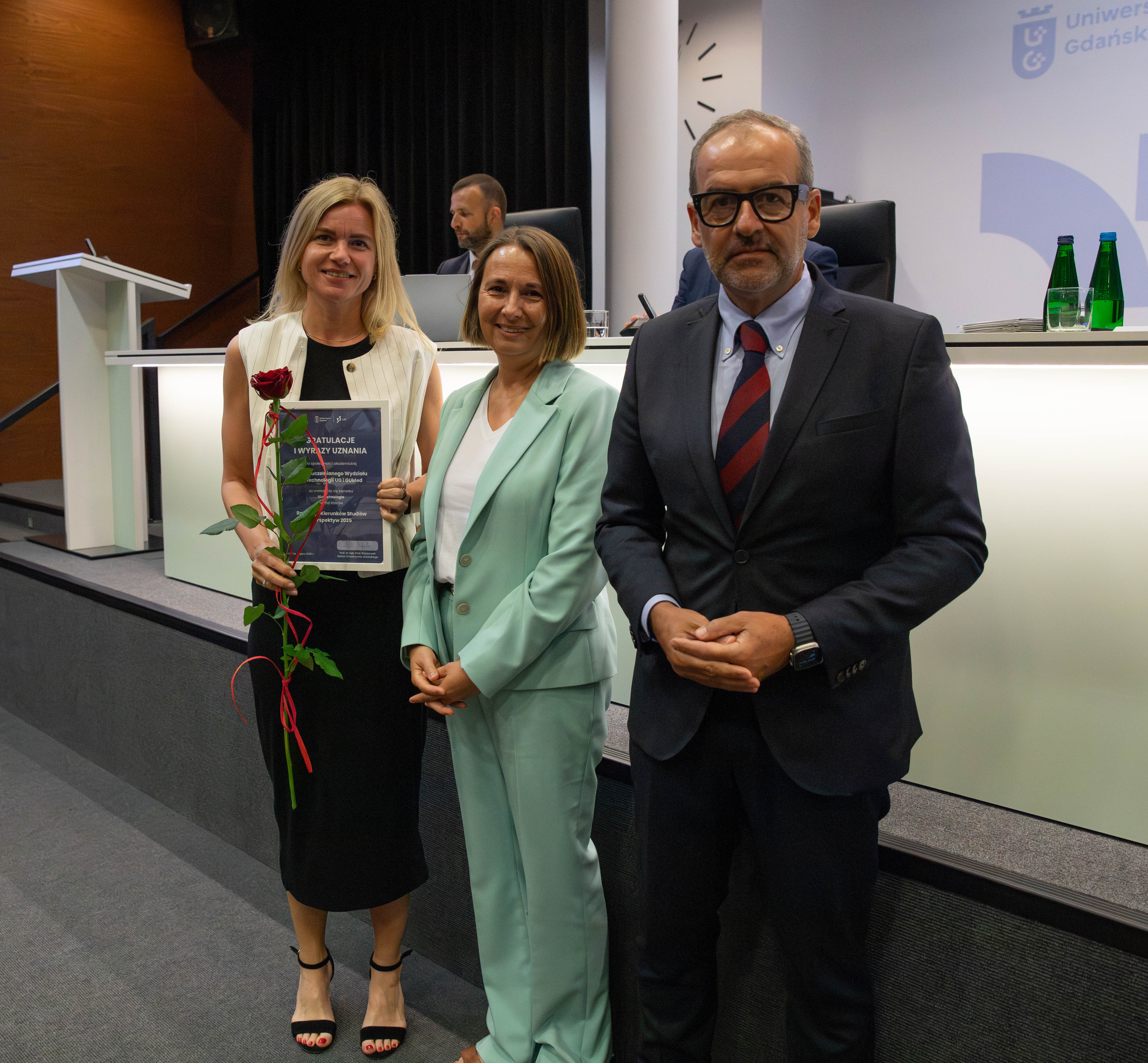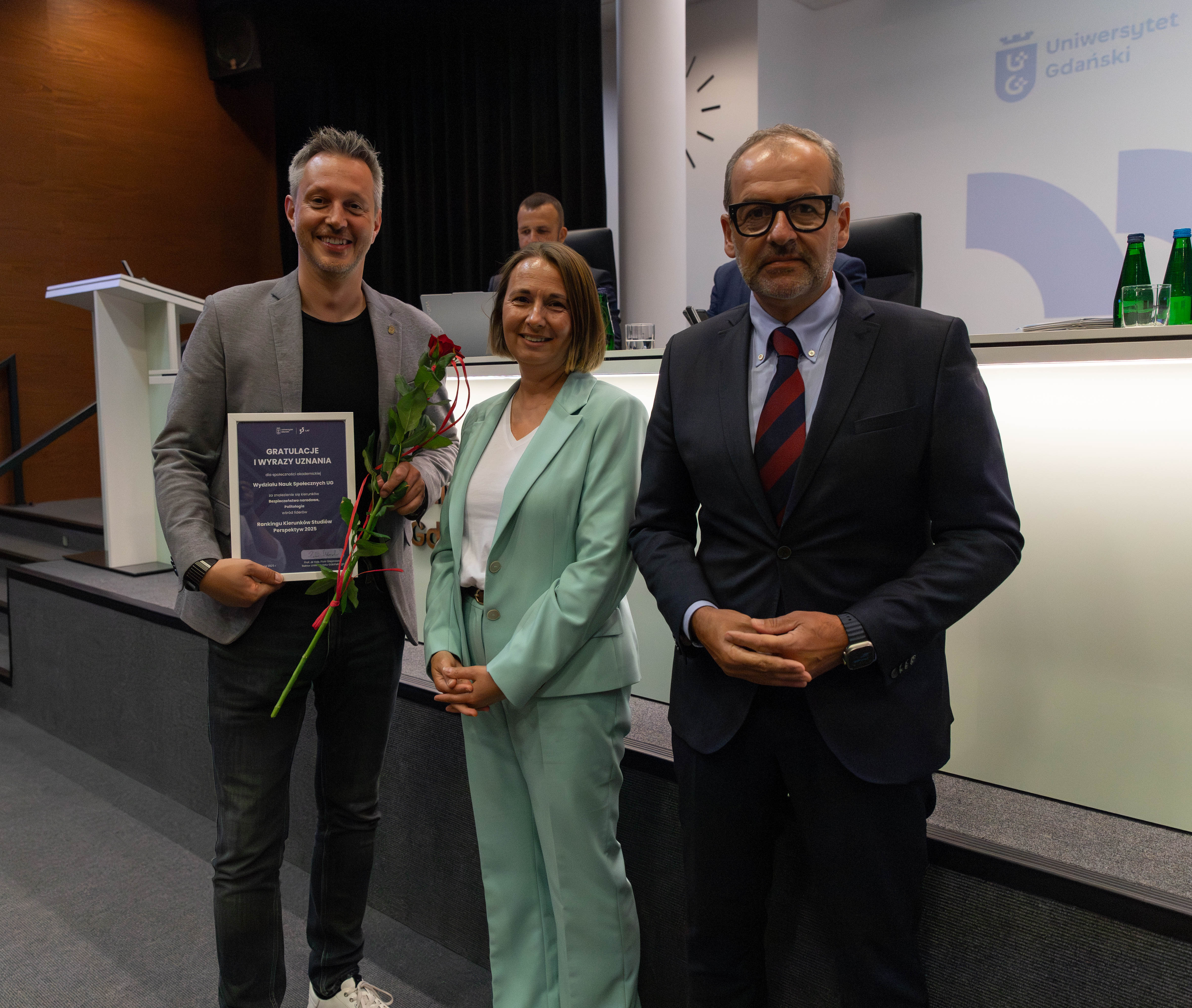 Następnie gratulacje i dyplomy dla społeczności akademickiej z rąk Rektora prof. Piotra Stepnowskiego i Prorektor ds. Kształcenia dr Ewy Szymczak, prof. UG odbierali dziekani i prodziekani wydziałów, których kierunki znalazły się na wysokich miejscach rankingu Perspektyw: Wydział Historyczny - kierunek Historia, Wydział Biologii - kierunek Biologia, Międzyuczelniany Wydział Biotechnologii UG i GUmed - Biotechnologia, Wydział Nauk Społecznych - dwa kierunki: Bezpieczeństwo narodowe i Politologia, Wydział Zarządzania - Informatyka i ekonometria, Wydział Filologiczny - Kulturoznawstwo, Wydział Oceanografii i Geografii - Geografia, Wydział Matematyki, Fizyki i Informatyki - Informatyka oraz Bezpieczeństwo jądrowe i ochrona radiologiczna, Wydział Chemii - Ochrona środowiska. Wydział Prawa i Administracji został wyróżniony za pozycje kierunków Administracja i Prawo w rankingu „Perspektyw” oraz za 4 miejsce w rankingu studiów prawniczych „Dziennika Gazety Prawnej”.