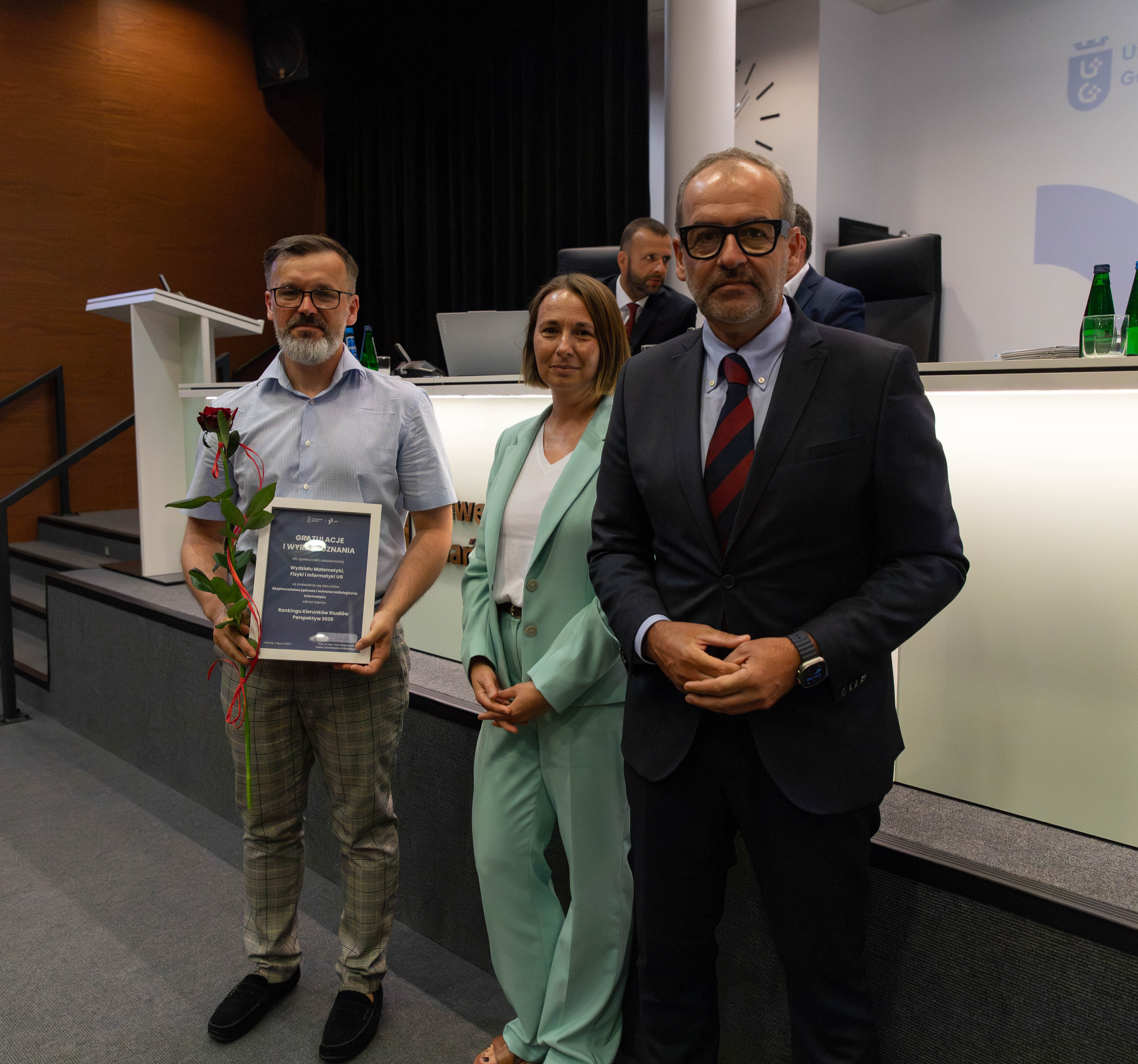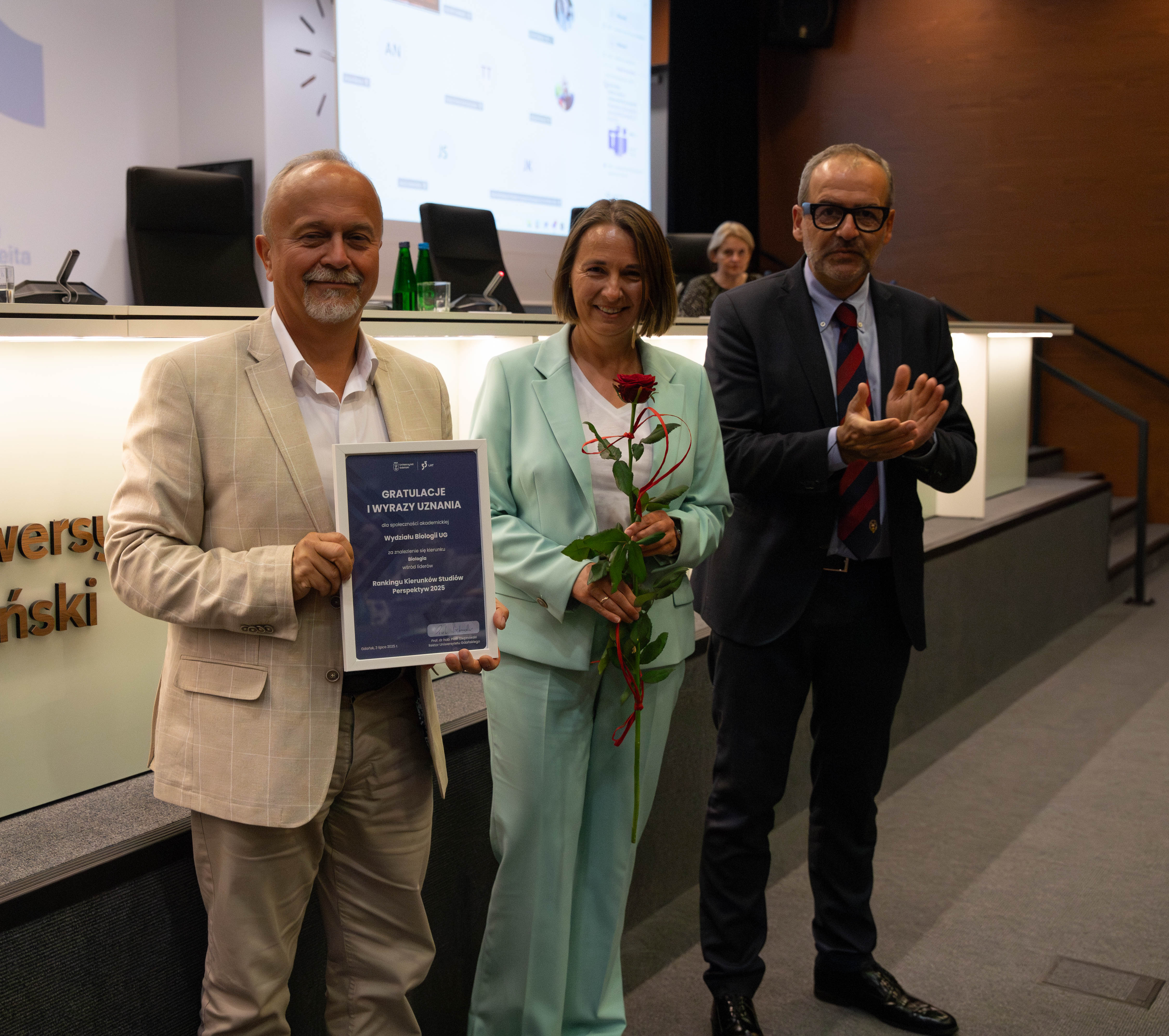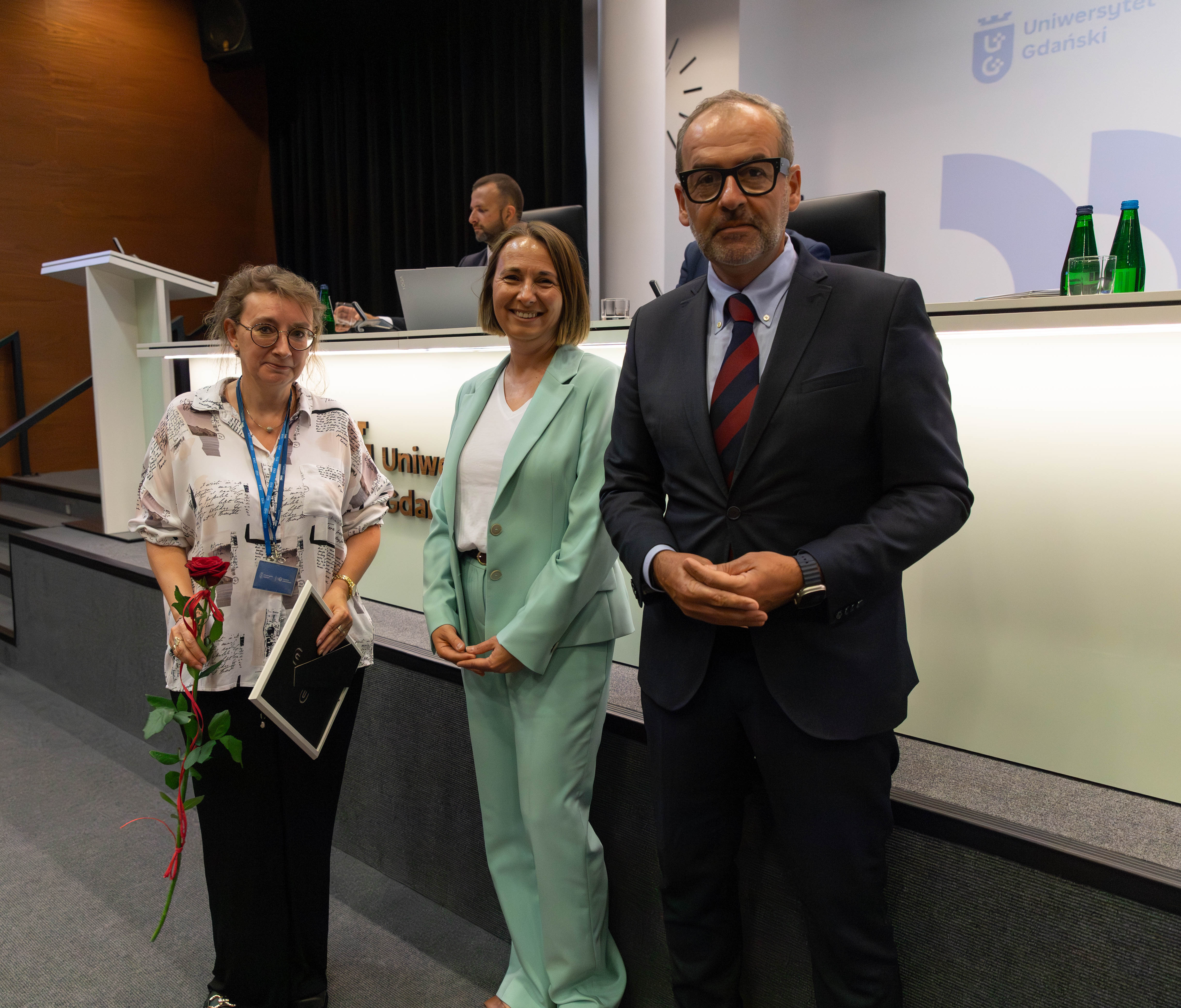 Następnie gratulacje i dyplomy dla społeczności akademickiej z rąk Rektora prof. Piotra Stepnowskiego i Prorektor ds. Kształcenia dr Ewy Szymczak, prof. UG odbierali dziekani i prodziekani wydziałów, których kierunki znalazły się na wysokich miejscach rankingu Perspektyw: Wydział Historyczny - kierunek Historia, Wydział Biologii - kierunek Biologia, Międzyuczelniany Wydział Biotechnologii UG i GUmed - Biotechnologia, Wydział Nauk Społecznych - dwa kierunki: Bezpieczeństwo narodowe i Politologia, Wydział Zarządzania - Informatyka i ekonometria, Wydział Filologiczny - Kulturoznawstwo, Wydział Oceanografii i Geografii - Geografia, Wydział Matematyki, Fizyki i Informatyki - Informatyka oraz Bezpieczeństwo jądrowe i ochrona radiologiczna, Wydział Chemii - Ochrona środowiska. Wydział Prawa i Administracji został wyróżniony za pozycje kierunków Administracja i Prawo w rankingu „Perspektyw” oraz za 4 miejsce w rankingu studiów prawniczych „Dziennika Gazety Prawnej”.