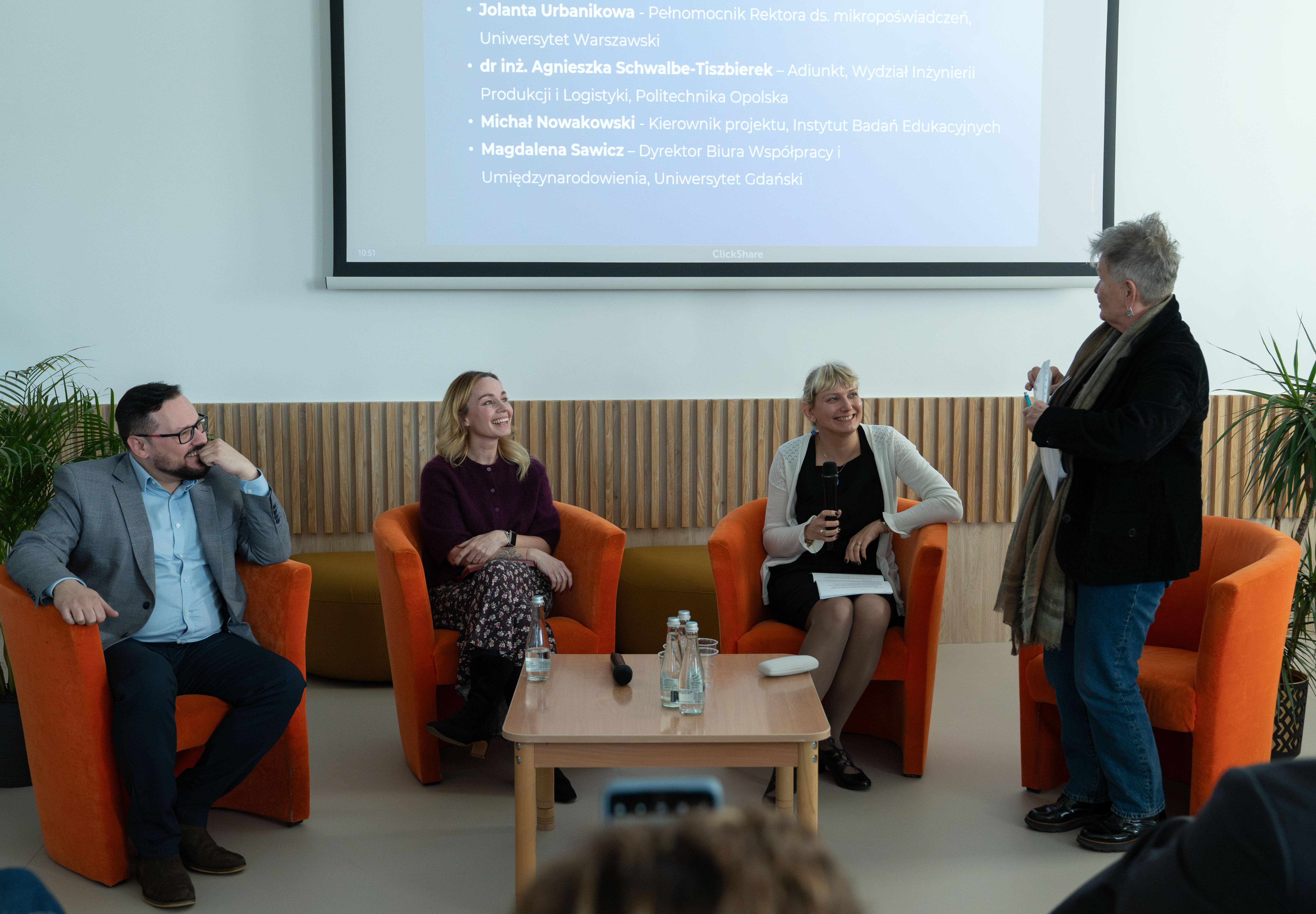 Podczas konferencji odbyły się cztery panele dyskusyjne: 1) Mikropoświadczenia w praktyce akademickiej (z ramienia UG uczestniczyła w nim Dyrektorka Biura Współpracy i Umiędzynarodowienia Magdalena Sawicz); 2) Gotowość polskich uczelni we wdrażaniu elastycznych ścieżek kształcenia; 3) Doświadczenia i oczekiwania studentów wobec mikropoświadczeń; 4) Cyfrowe poświadczenia Europass. Dyskutowano zarówno o ogólnych założeniach strategicznych wdrażania mikropoświadczeń, jak i o bardzo konkretnych wyzwaniach i problemach, przed którymi stoją poszczególne instytucje edukacyjne, a które mogłyby zostać rozwiązane właśnie mikropoświadczeniami.