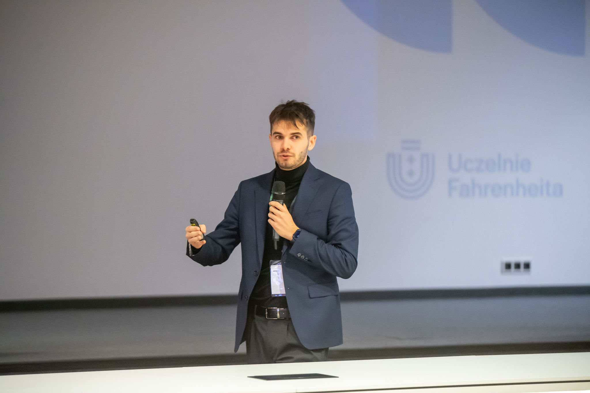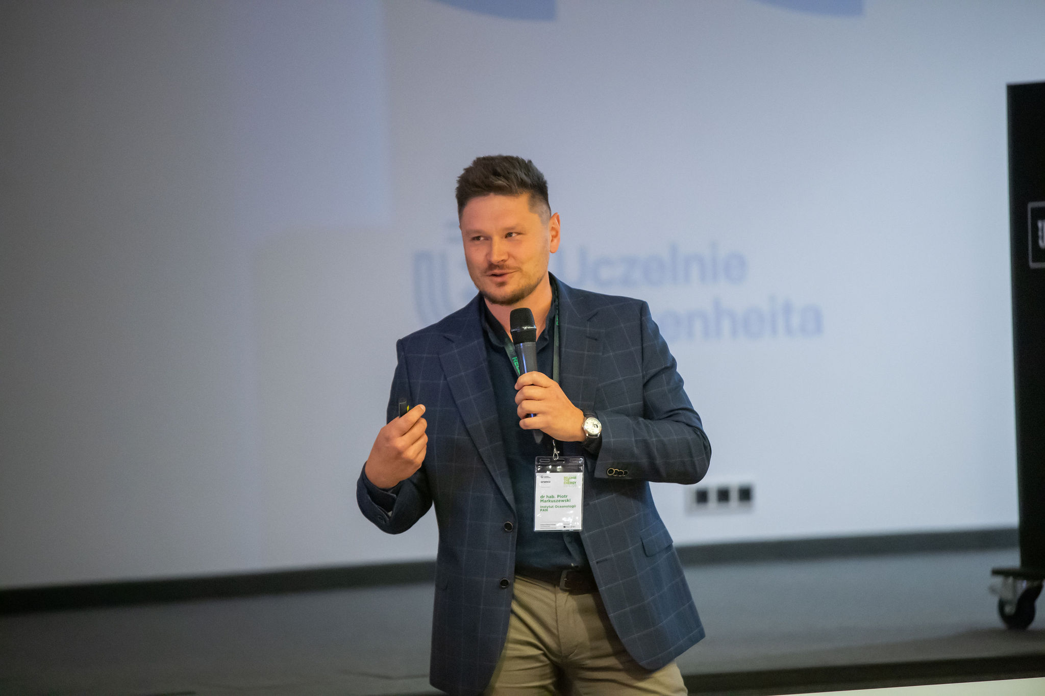 Pierwszą prezentację wygłosił zagraniczny gość - John Henn z Aramco Europe, który mówił o tym, jak przekuwać wnioski z danych na realne działania. Po keynote speakerze scenę przejęli studenci, rozpoczynając panel poświęcony polityce, prawu i wyzwaniom transformacji energetycznej. Jako pierwszy głos zabrał Mariusz Sadłowski, stawiając pytanie, czy dynamiczny rozwój OZE może jednocześnie generować problemy - i wskazując na dualizm polityczno-instytucjonalny, który temu towarzyszy. Następnie Filip Kaszubowski zwrócił uwagę, że mimo rekordowej produkcji z OZE rachunki wciąż rosną; prelegent omówił więc możliwości ograniczania kosztów transformacji. Marta Kowaliszyn wraz z Kacprem Lewandowskim pokazali zaś, jak prawo technologiczne nadąża (lub nie) za innowacjami w energetyce, w tym za zastosowaniami AI i blockchainu. Na koniec bloku odbyła się prezentacja Pauli Tęczy z Pomorskiej Specjalnej Strefy Ekonomicznej, podczas której prelegentka opowiedziała, jak PSSE wspiera transformację energetyczną Polski. Dodatkową atrakcją, zapewnioną przez partnera konferencji, był quiz, w którym można było wygrać bezprzewodowe słuchawki.