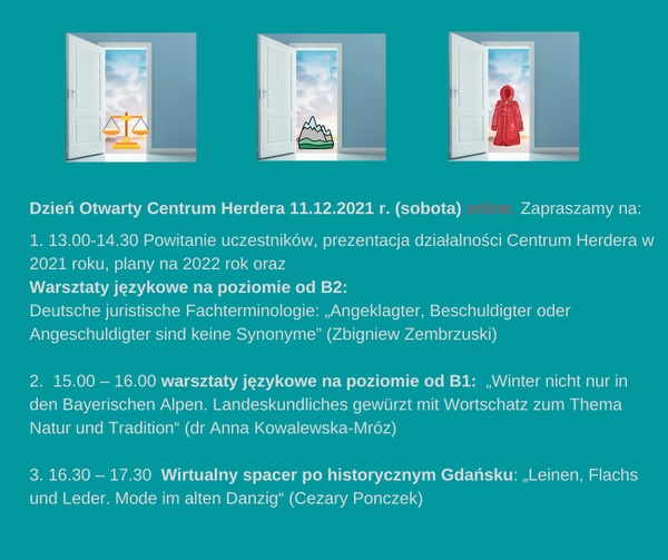 Zgłoszenia mailowe z zaznaczeniem wybranych wydarzeń należy przesłać do Centrum Herdera UG. Po potwierdzeniu, uczestnicy otrzymają szczegółowe informacje o polaczeniu na platformie zoom. Ilość uczestników jest ograniczona. O udziale decyduje kolejność zgłoszenia.