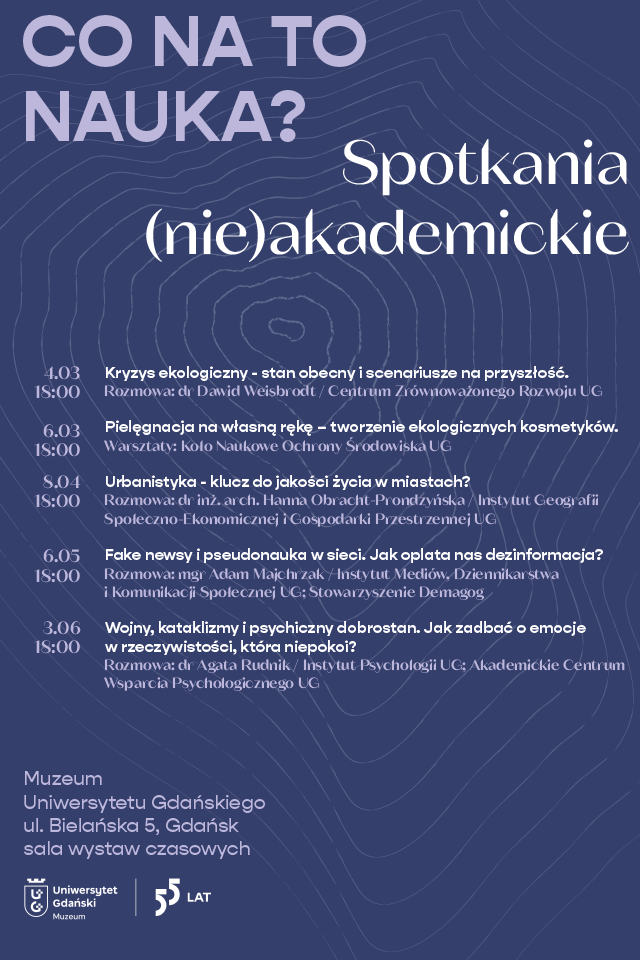 Zapraszamy do udziału w cyklu interdyscyplinarnych spotkań z pracownikami naukowymi Uniwersytetu Gdańskiego poświęconych palącym problemom współczesnego świata. W trakcie kameralnych, popularnonaukowych spotkań porozmawiamy z ekspertami z zakresu ochrony środowiska, nowych mediów, urbanistyki oraz psychologii. Wspólnie zastanowimy się, jakie narzędzia w rozumieniu i kontrolowaniu zjawisk rzeczywistości oferuje nam nauka.