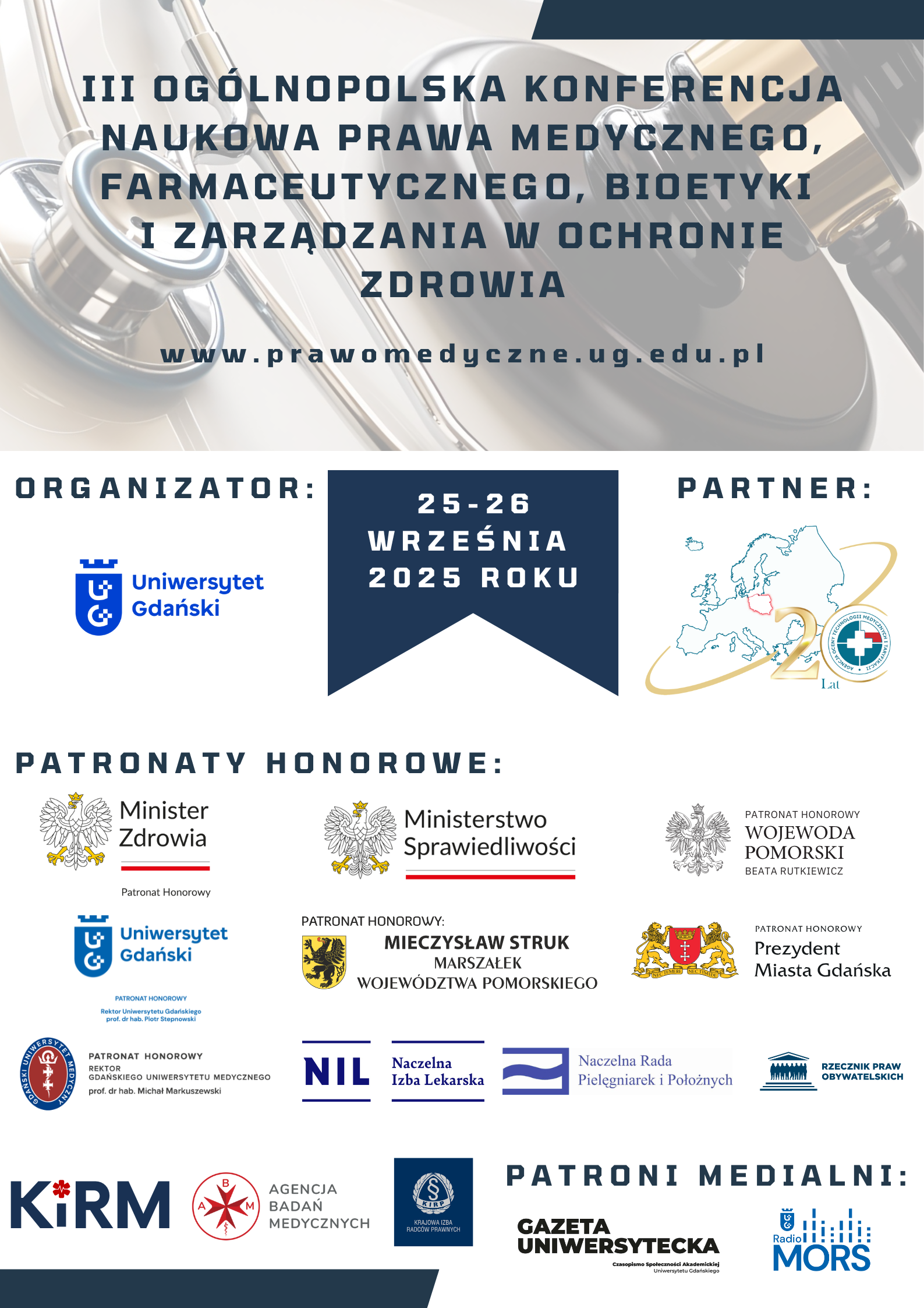 Zapraszamy do udziału w III Ogólnopolskiej Konferencji Naukowej Prawa Medycznego, Farmaceutycznego, Bioetyki i Zarządzania w Ochronie Zdrowia, która odbędzie się w dniach 25-26 września 2025 roku.